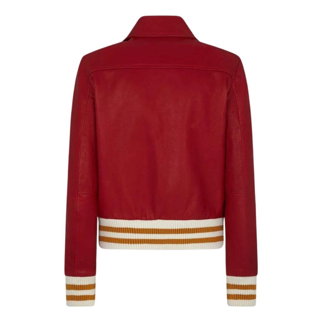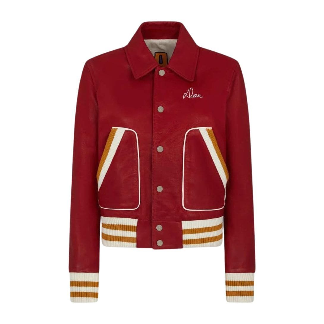 Constructed from premium quality leather, the jacket boasts a supple texture that exudes luxury and durability. The leather’s rich, buttery-smooth finish adds a touch of sophistication, making it a versatile piece that effortlessly transitions from casual outings to more formal occasions. The classic varsity-inspired design is enhanced by contrasting ribbed knit trimmings at the collar, cuffs, and hem, which not only provide a snug fit but also accentuate the jacket’s athletic silhouette.