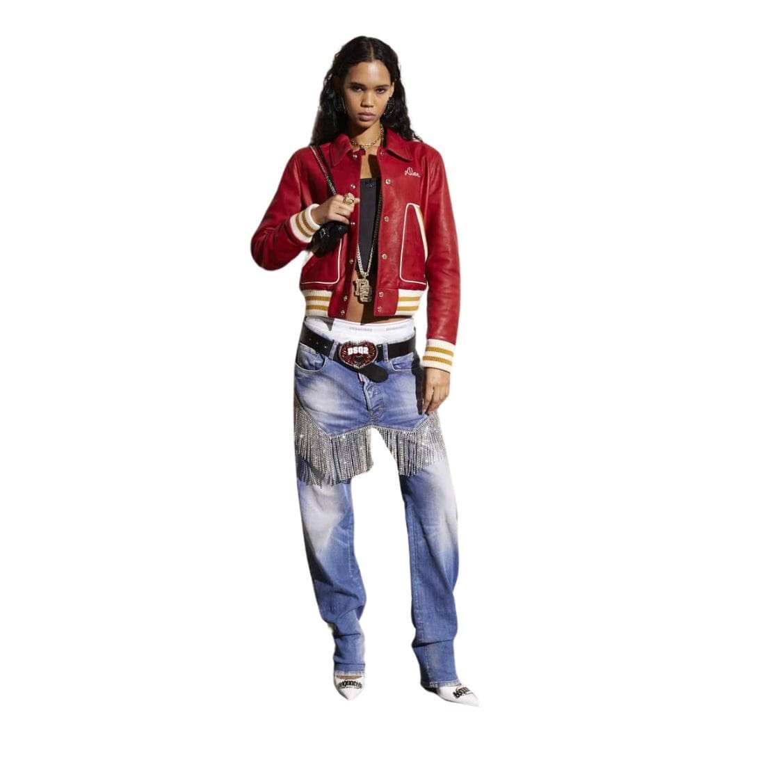 With its versatile design and impeccable craftsmanship, the DSQUARED2 Signature Varsity Leather Bomber is more than just a piece of outerwear—it’s a statement of refined style and urban sophistication. Whether paired with distressed denim for a laid-back streetwear vibe or layered over a tailored shirt for a polished ensemble, this jacket effortlessly elevates any look with its timeless appeal and undeniable luxury. Made to withstand the test of time, it’s an investment piece that promises to be a wardrobe staple for years to come, embodying the spirit of modern luxury and sartorial excellence.