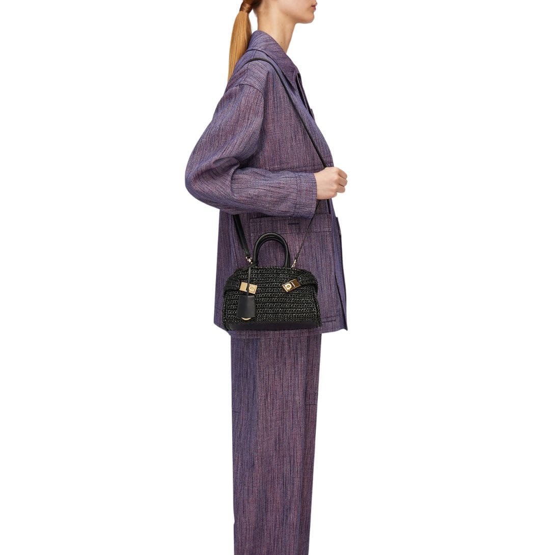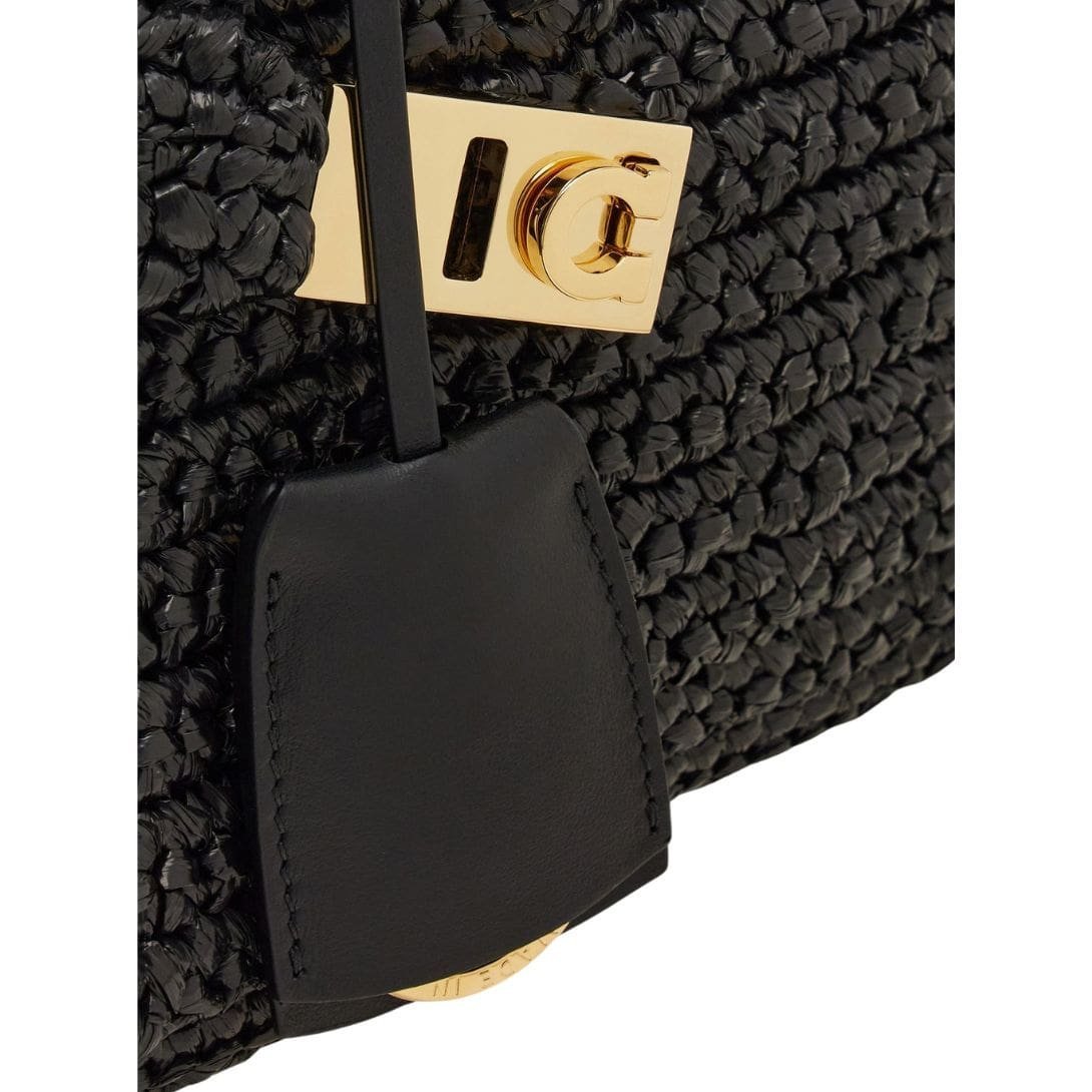 Innovative and captivating, the Ferragamo Hug mini bag introduces a distinctive silhouette crafted from hand-woven raffia, infused with seasonal hues that evoke a sense of warmth and effortless style. Its compact design exudes a sense of cool sophistication, offering a perfect balance of functionality and fashion-forward allure.