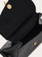Accentuating the bag’s opulence is the chic golden custom clasp adorning the front, a signature hallmark of Ferragamo’s commitment to exquisite craftsmanship and unparalleled quality. Beyond its ornate exterior, the handbag offers a practical yet indulgent experience. Its spacious interior, meticulously designed to accommodate the modern woman’s essentials, boasts flat pockets that ensure effortless organization of personal effects, marrying style with functionality seamlessly.