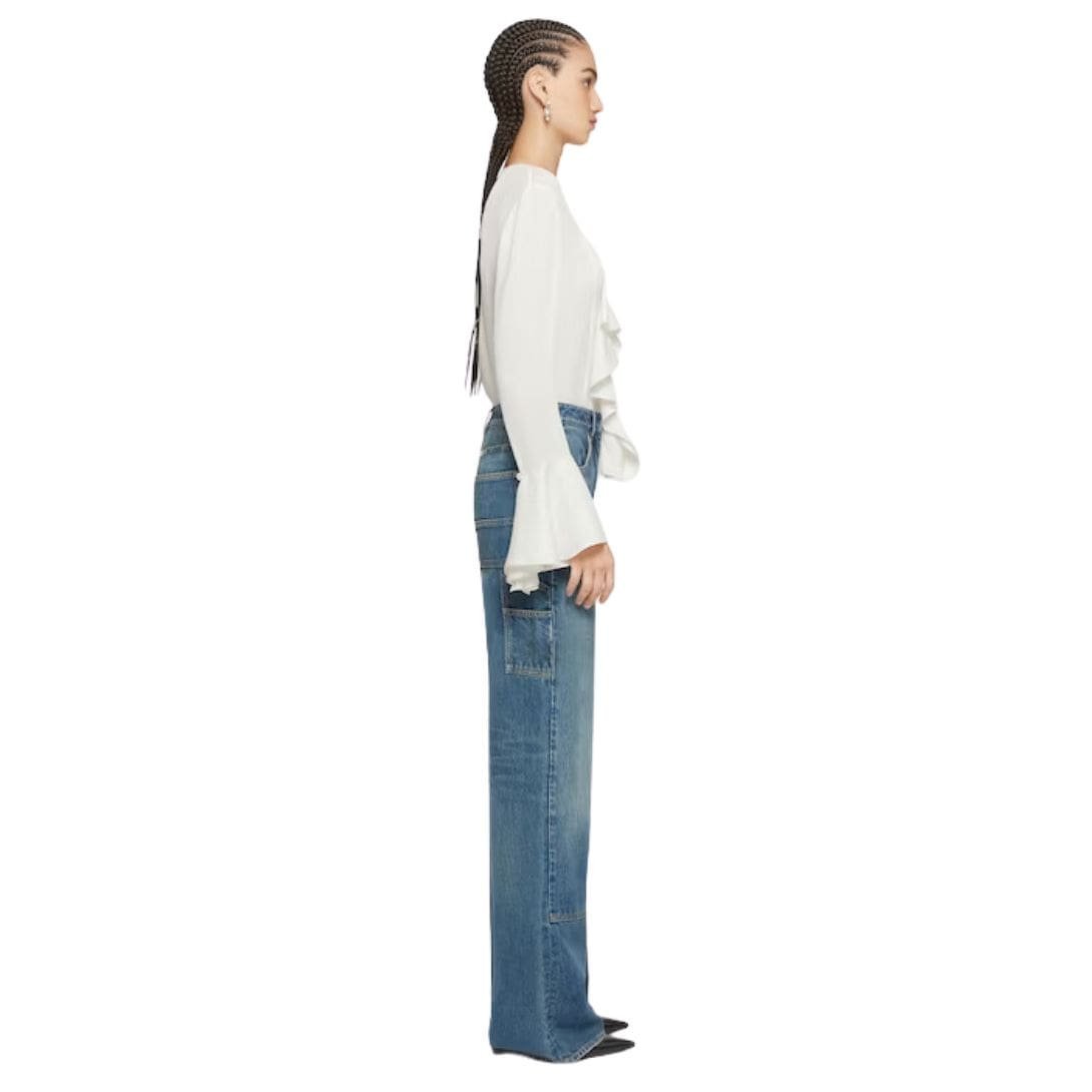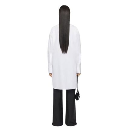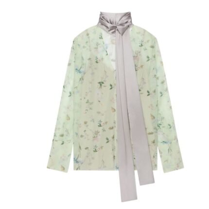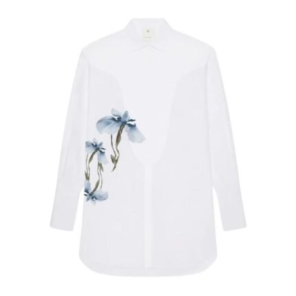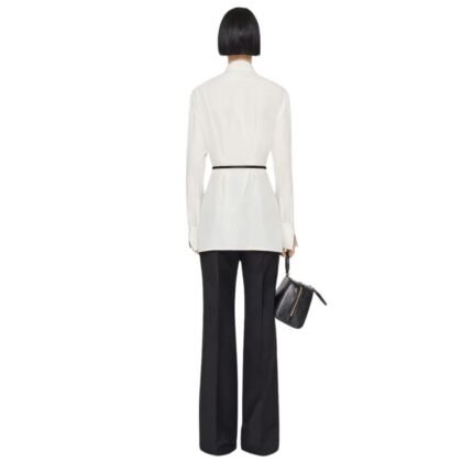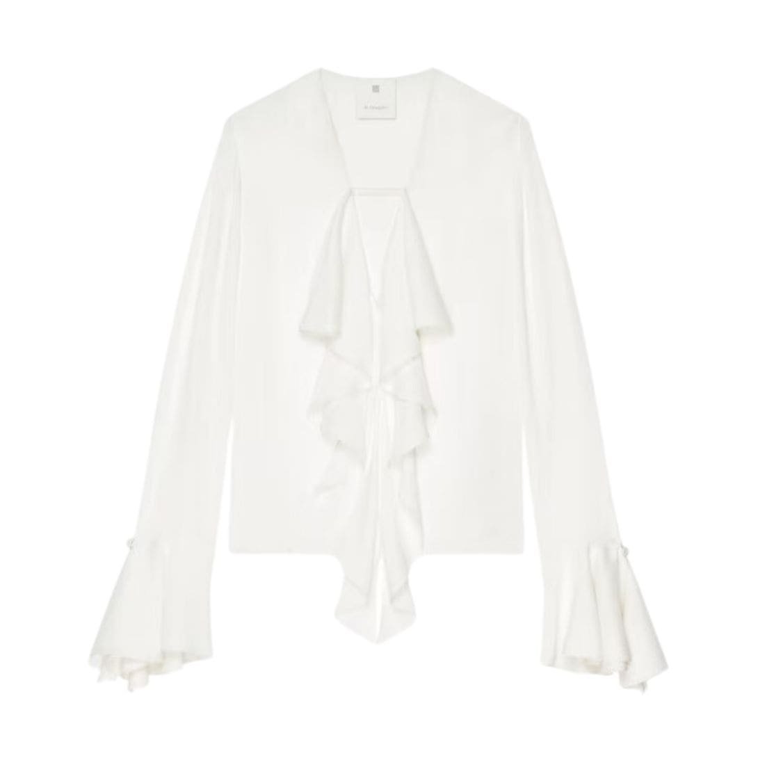Introducing the Givenchy Blouse In 4G Silk With Ruffles embodies a perfect fusion of sophistication and playful charm. Crafted from luxurious silk adorned with the iconic 4G logo pattern, this blouse exudes opulence and refinement. The addition of ruffles along the neckline and sleeves adds a whimsical touch, infusing the piece with a sense of feminine grace and movement. Whether paired with tailored trousers for a polished office look or dressed down with denim for a chic weekend ensemble, this blouse effortlessly transitions from day to night with its versatile elegance. With meticulous attention to detail and impeccable craftsmanship, Givenchy continues to redefine modern luxury with this timeless wardrobe essential.