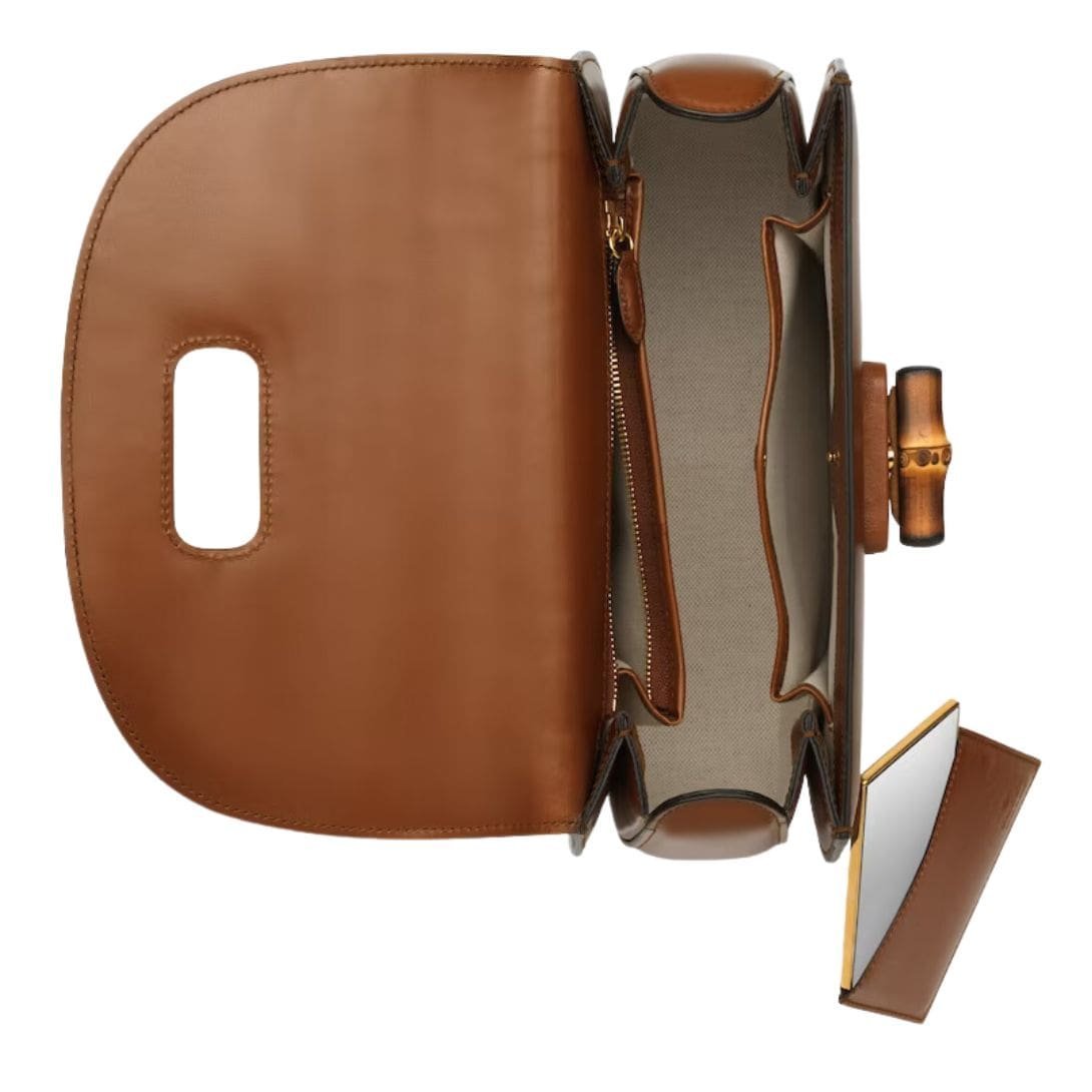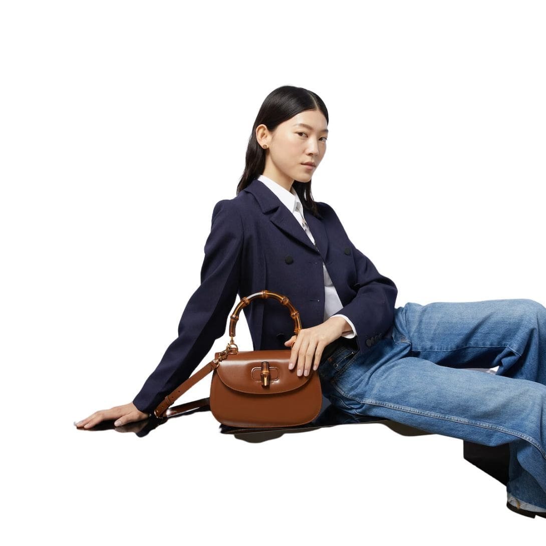 Crafted from supple, high-quality leather, the bag features a rich, textured surface that exudes understated opulence. The medium size strikes a perfect balance, offering ample space for daily essentials without sacrificing style. Its distinctive top handle, made from bamboo, pays homage to the bag’s original design while adding a unique, organic touch. The bamboo handle, known for its durability and flexibility, is meticulously crafted to achieve a smooth, polished finish that enhances the bag’s refined aesthetic.