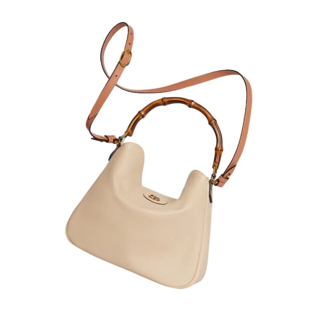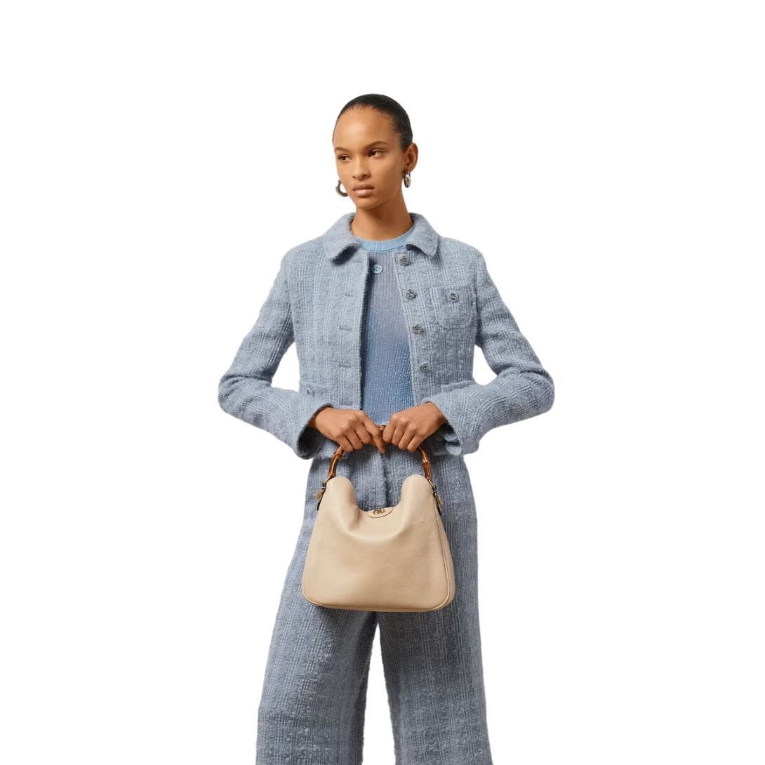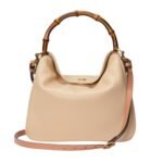 The Diana bag is rendered in rich, supple leather, available in a variety of classic hues and contemporary shades, each meticulously selected to complement its design. The bag’s structure is defined by its clean lines and gently rounded edges, which lend it a refined, understated charm. A standout feature is its iconic bamboo handle, a nod to Gucci’s heritage, which adds a touch of vintage allure and artisanal craftsmanship. GUCCI DIANA MEDIUM SHOULDER BAG