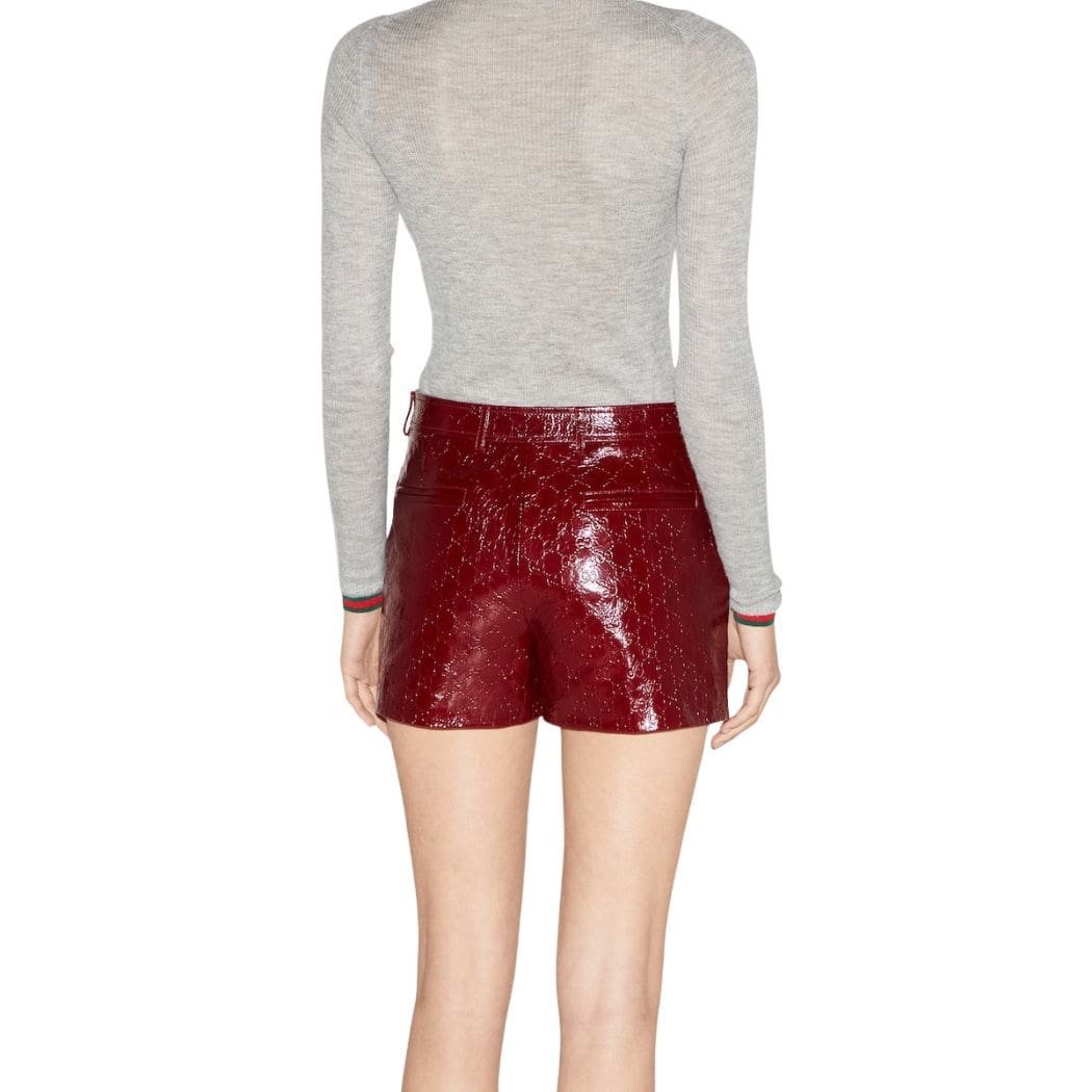 Crafted from GG embossed shiny leather in the striking Gucci Rosso Ancora red hue, these shorts are a testament to the brand’s distinctive aesthetic. The juxtaposition of materials and colors creates a bold statement piece that captures attention effortlessly.