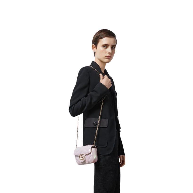 The versatility of the GG Marmont Super Mini Bag is enhanced by its adjustable chain strap, which can be worn in multiple ways. Whether draped over the shoulder, worn crossbody, or carried as a clutch by tucking in the chain, this bag adapts effortlessly to different occasions and styles. The chain, crafted from the same antiqued gold-tone metal as the GG logo, adds a touch of opulence and complements the bag’s overall aesthetic. GUCCI GG MARMONT SUPER MINI BAG