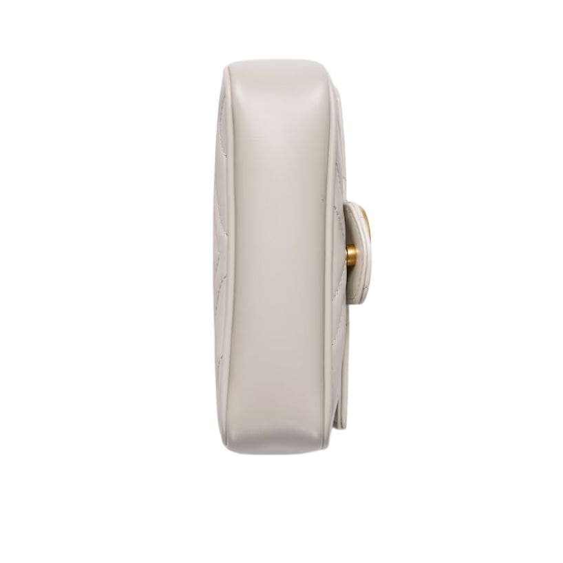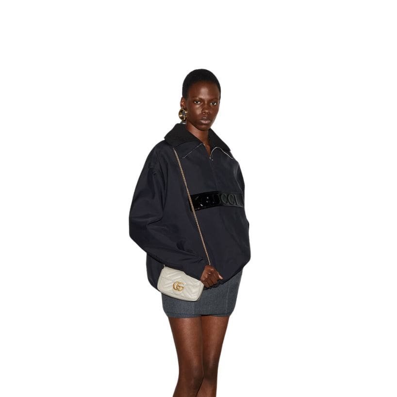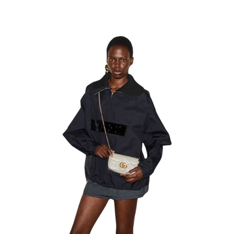 The versatility of the GG Marmont Super Mini Bag is enhanced by its adjustable chain strap, which can be worn in multiple ways. Whether draped over the shoulder, worn crossbody, or carried as a clutch by tucking in the chain, this bag adapts effortlessly to different occasions and styles. The chain, crafted from the same antiqued gold-tone metal as the GG logo, adds a touch of opulence and complements the bag’s overall aesthetic. GUCCI GG MARMONT SUPER MINI BAG