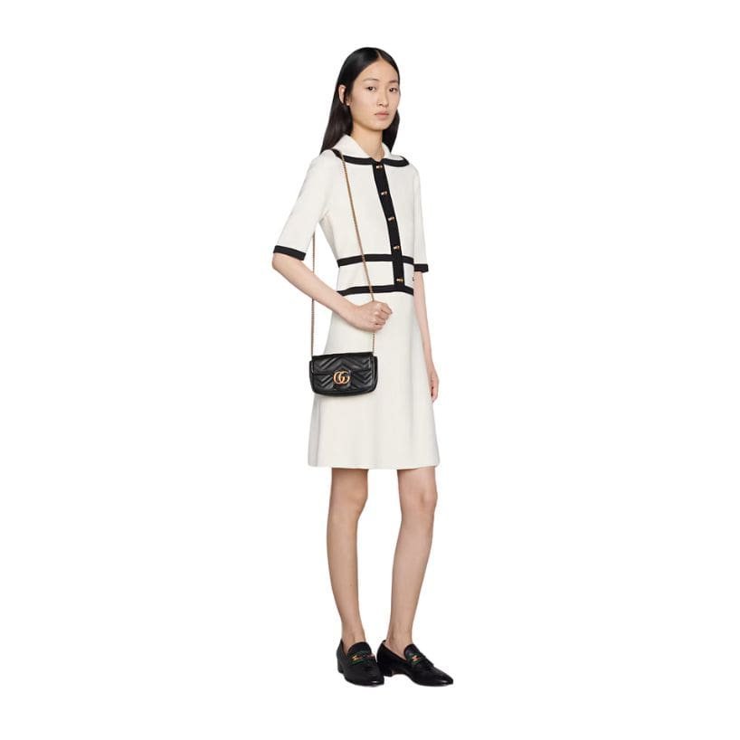 The versatility of the GG Marmont Super Mini Bag is enhanced by its adjustable chain strap, which can be worn in multiple ways. Whether draped over the shoulder, worn crossbody, or carried as a clutch by tucking in the chain, this bag adapts effortlessly to different occasions and styles. The chain, crafted from the same antiqued gold-tone metal as the GG logo, adds a touch of opulence and complements the bag’s overall aesthetic. GUCCI GG MARMONT SUPER MINI BAG