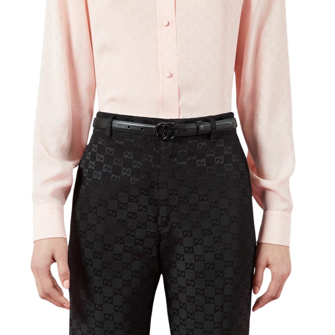 At the heart of our ethos lies a steadfast commitment to timeless elegance and unparalleled craftsmanship. Embodying this dedication, our Spring Summer 2020 collection proudly reintroduces the iconic Double G emblem, bathed in a resplendent gold-tone hue, adorning a slender  Gucci GG Marmont Thin Belt tailored for the modern woman.
