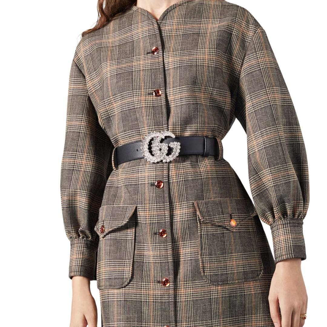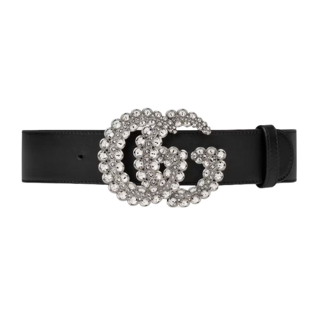 Central to its allure is the metal Double G buckle, embellished with dazzling crystals that catch the light with every movement. The buckle measures 3.58 inches in width and 2.76 inches in height, making a bold statement while adding a touch of glamour to any ensemble.
