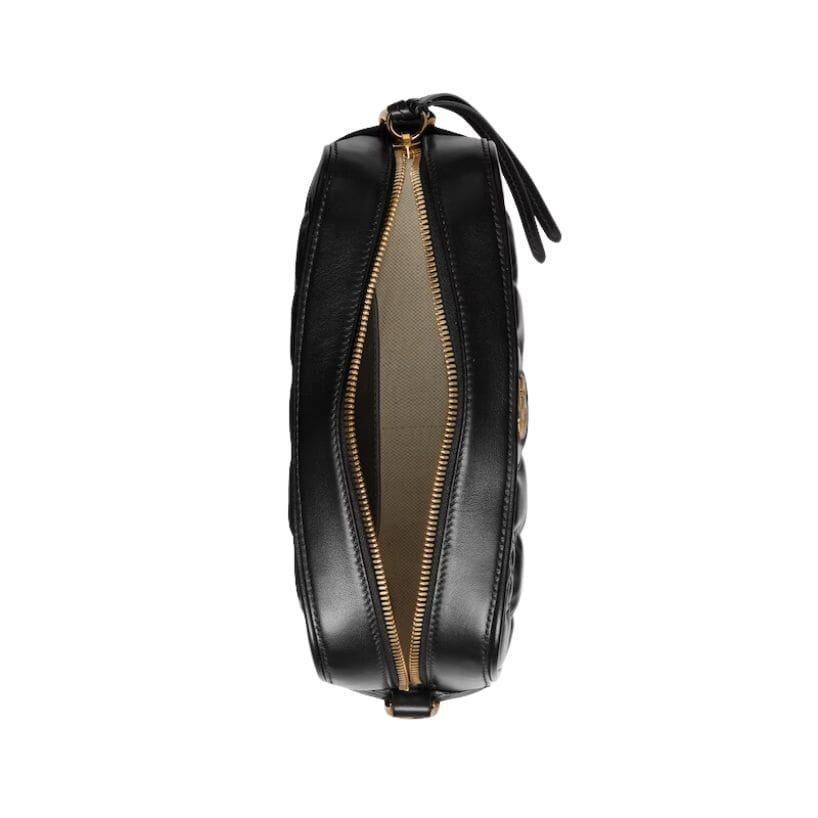 The interior of the GG Matelassé Small Shoulder Bag is thoughtfully designed to offer practicality alongside luxury. Lined with a soft fabric, it includes a main compartment and a slip pocket, perfect for organizing small items. The top zip closure ensures security and ease of access, while the exterior features a subtly embossed GG logo on the front flap, underscoring the brand’s signature style. GUCCI GG MATELASSE SMALL BAG