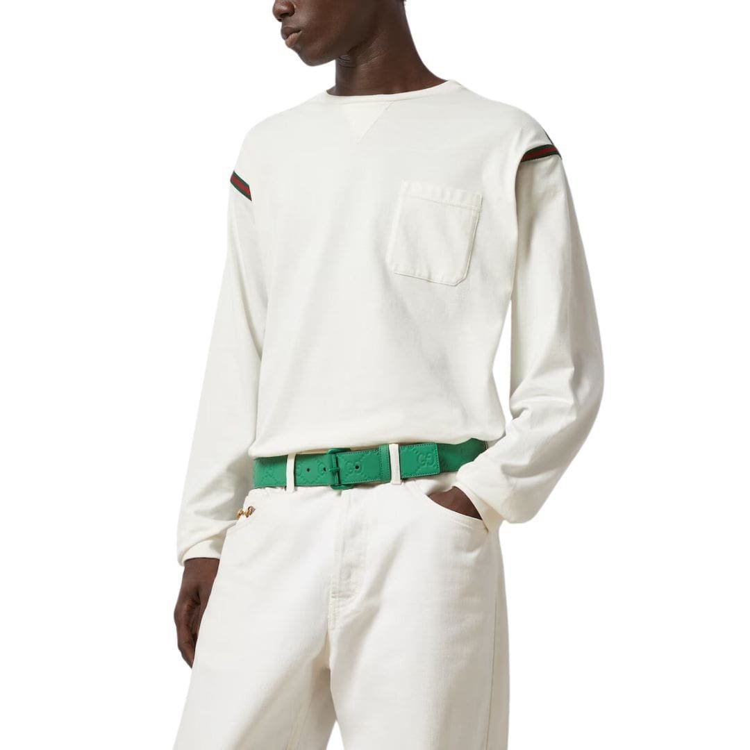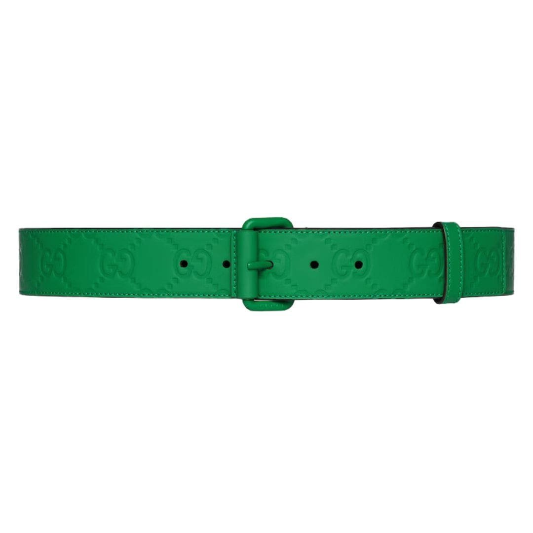At Gucci, our dedication to versatile design and innovation shines belt, a standout piece from the Gucci Cruise 2024 collection. Crafted from Gucci GG rubber-effect belt leather in a striking green hue, this belt seamlessly combines practicality with contemporary style, making it a versatile addition to any wardrobe.