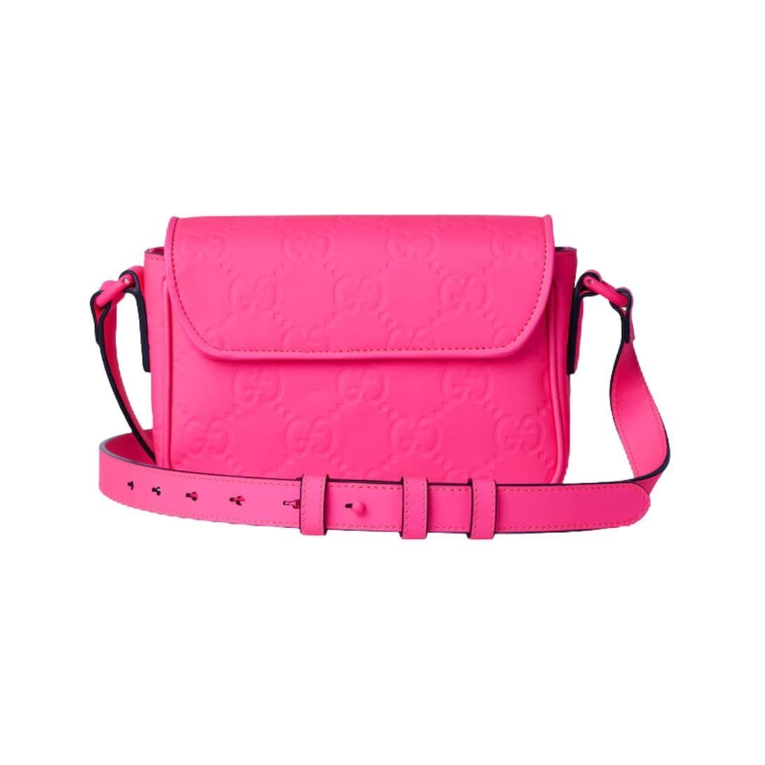 The bag is adorned with Gucci’s iconic GG logo, embossed prominently on the front. This subtle yet sophisticated branding element reinforces the bag’s prestigious heritage while blending seamlessly with its modern aesthetic. The GG logo is rendered in a complementary color that enhances the overall design without overwhelming it. GUCCI GG RUBBER EFFECT SUPER MINI BAG