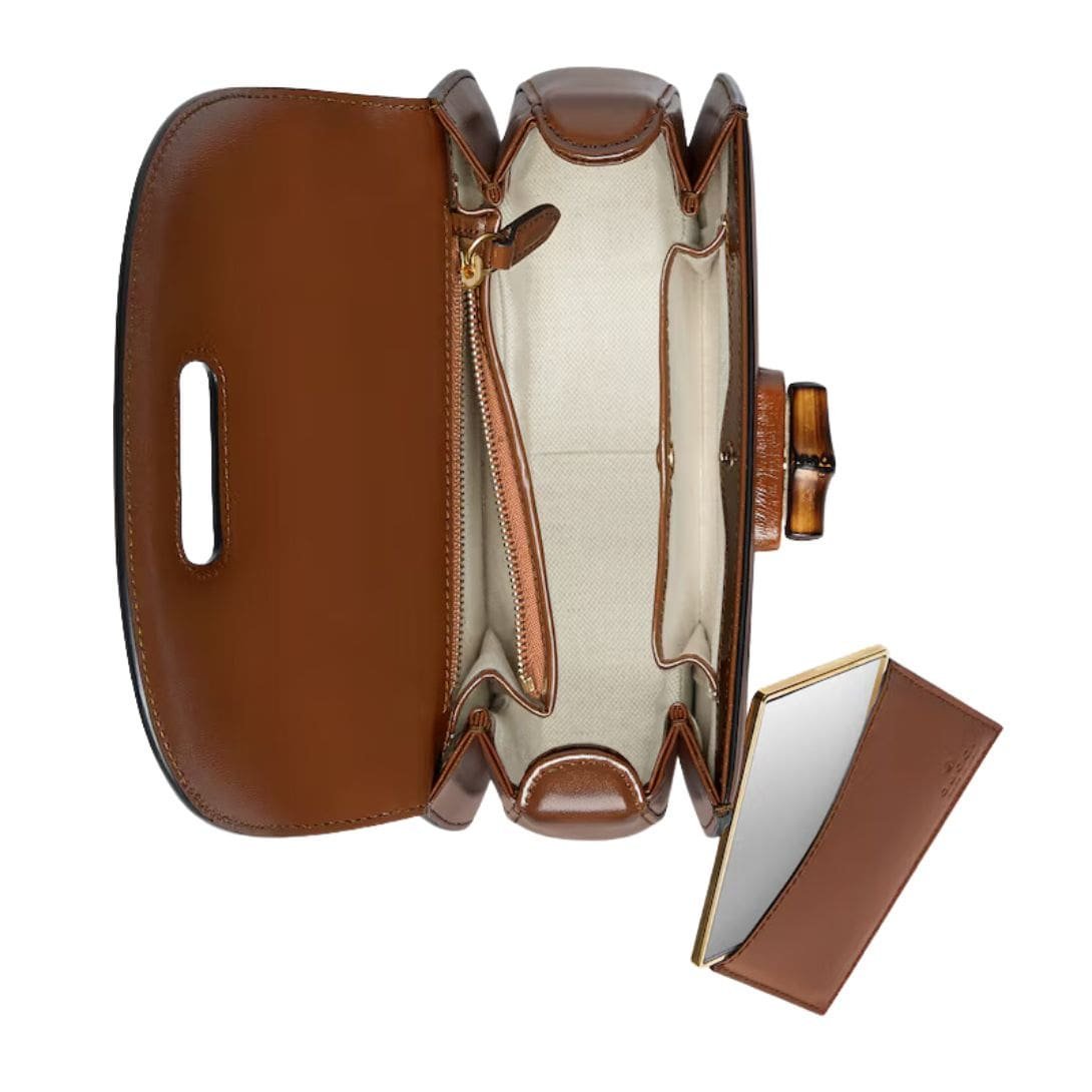 The bag is made from high-quality leather, which provides a luxurious texture and durable finish. Its small size makes it a versatile choice for both formal and casual occasions, while the sleek top handle adds a sophisticated touch. One of the most distinctive features of the Bamboo 1947 is its unique handle, which is crafted from bamboo—an element that pays homage to Gucci’s innovative use of materials and design in the mid-20th century. The bamboo handle is both functional and decorative, offering a chic alternative to traditional leather straps.