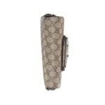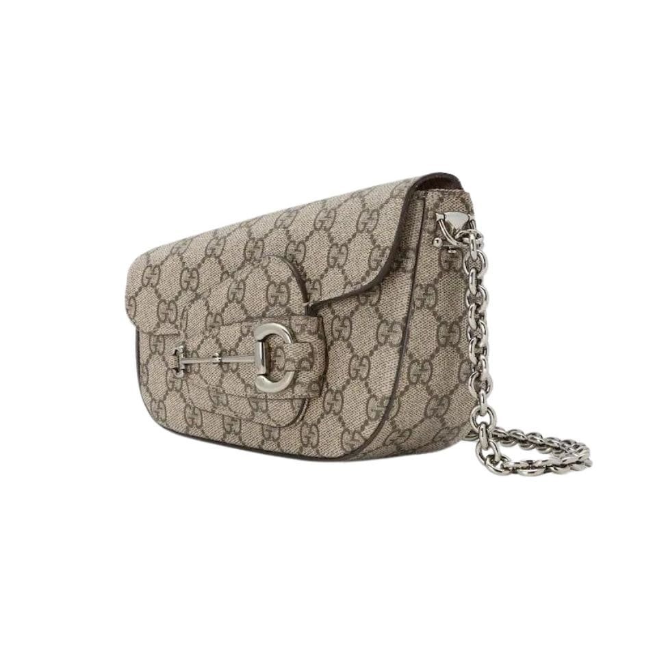The mini size of this shoulder bag makes it a versatile choice for both daytime and evening events. The beige canvas offers a neutral, yet refined backdrop, which is beautifully complemented by the rich ebony leather trim and the striking gold-toned Horsebit hardware. The gleaming Horsebit detail is not only a nod to Gucci’s equestrian roots but also adds a touch of opulence and charm to the overall design. GUCCI HORSEBIT 1955 MINI SHOULDER BAG IN BEIG AND EBONY