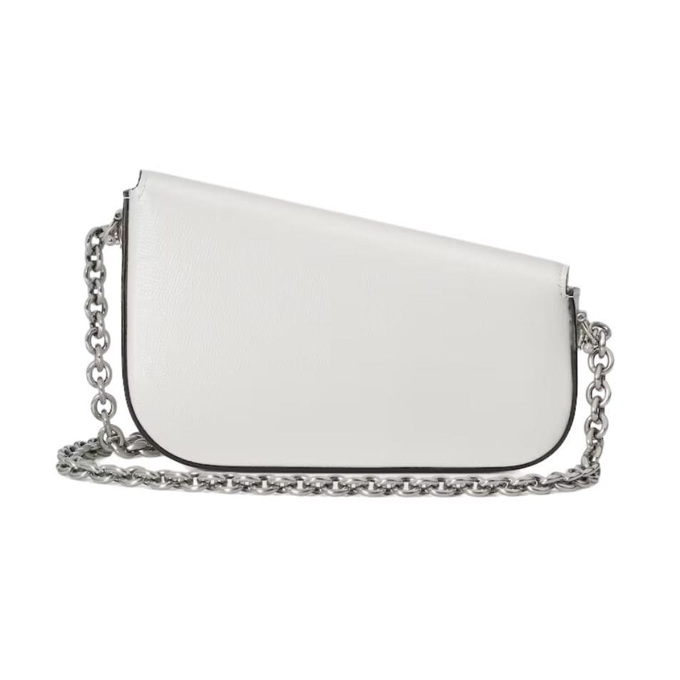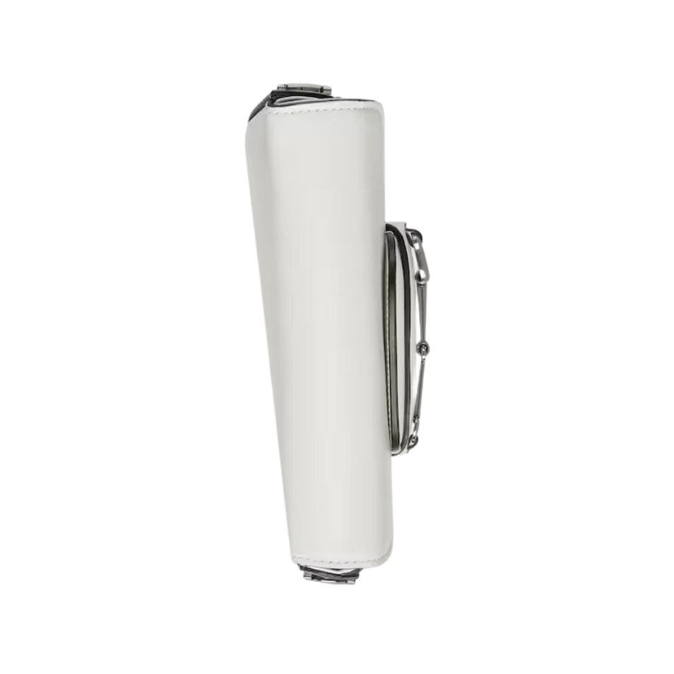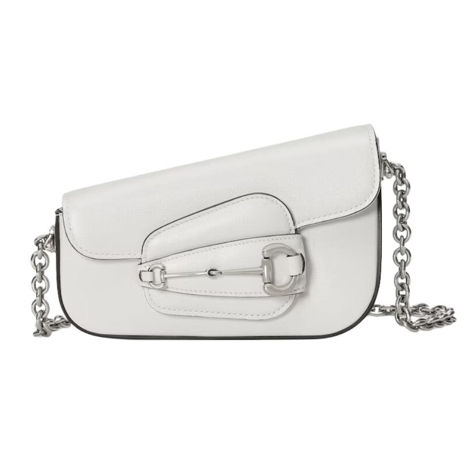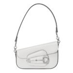 The mini shoulder bag features a sleek, structured silhouette that is both compact and versatile. The pristine white leather is smooth and glossy, accentuated by the gleaming gold-tone Horsebit hardware, which adds a touch of opulence. The iconic Horsebit detail, prominently displayed on the front flap, is a nod to Gucci’s equestrian roots and brings a sense of tradition to the modern design.