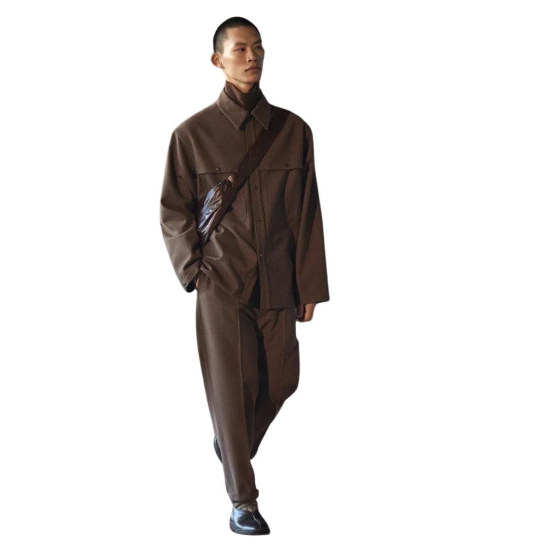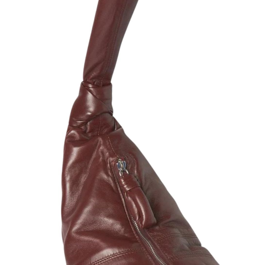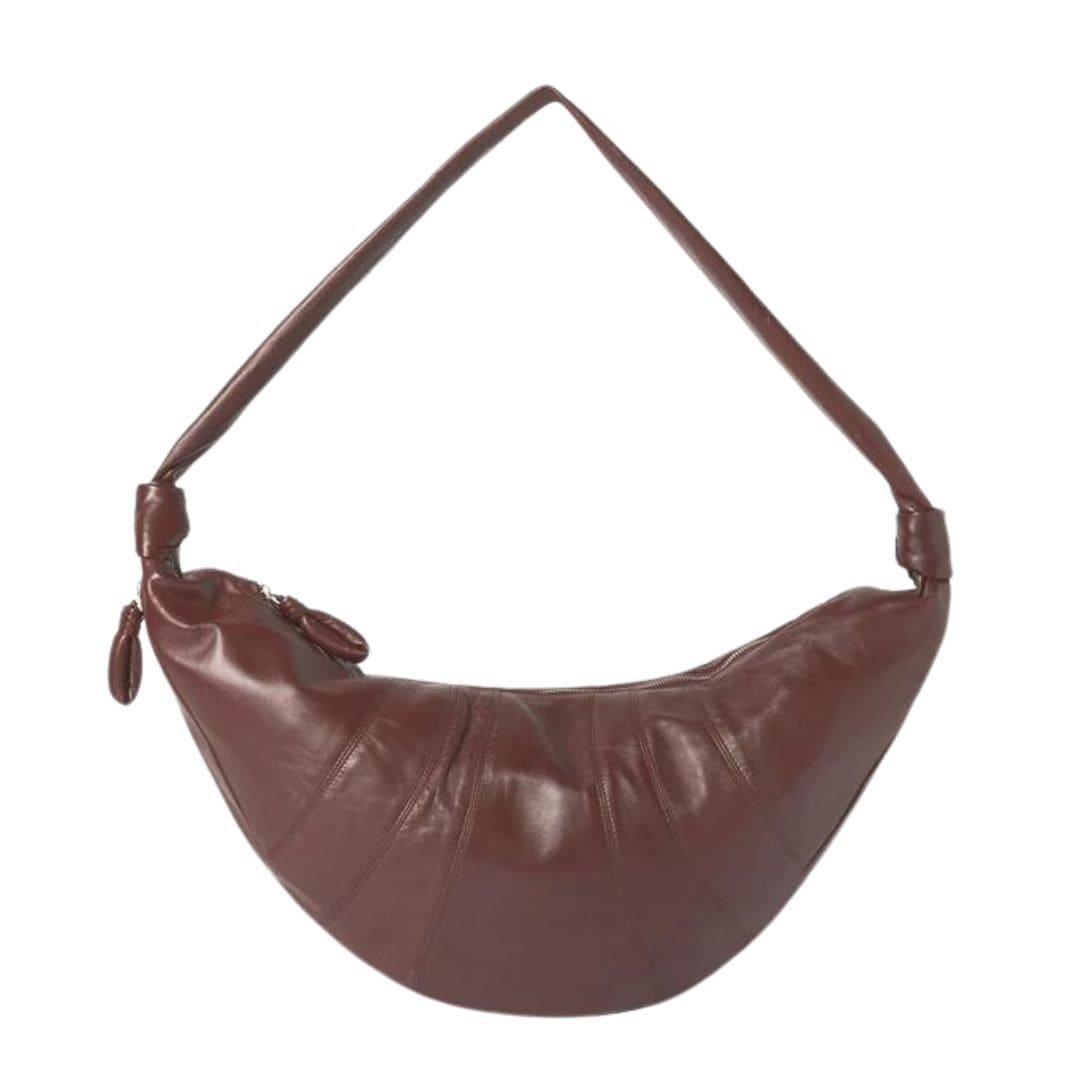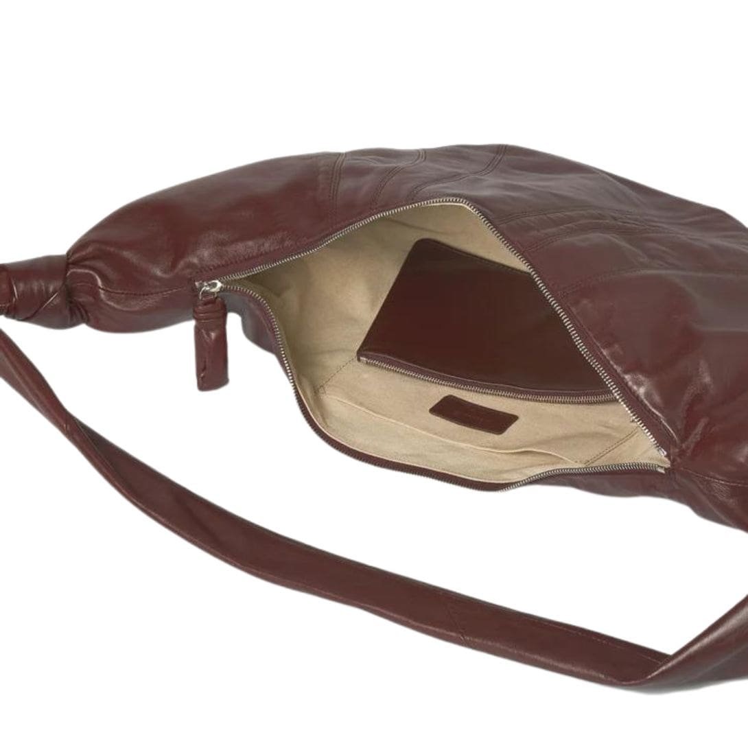 La Garconne Lemaire Large Croissant Bag is crafted from roasted pecan nappa leather in the large size. It features knot detailing at the shoulder strap with a covered tassel zipper pull and silver-tone metal hardware at the zip-top closure. Inside, there is a single pocket, and the bag is fully lined in beige cotton canvas.