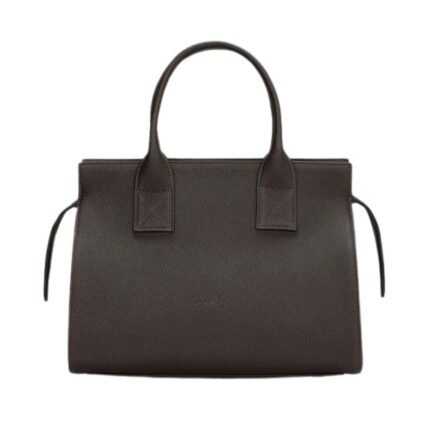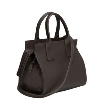 Marsèll presents its signature top-handle La Garconne Marsèll 4 in Orizontalle Bag in clay suede leather, featuring cinch-able sides for adjustable shape and multiple carrying options. The bag has a top zip closure and side snaps. Inside, it includes flap pockets and leather patch pockets atop a zip pocket. An optional crossbody strap is also included.