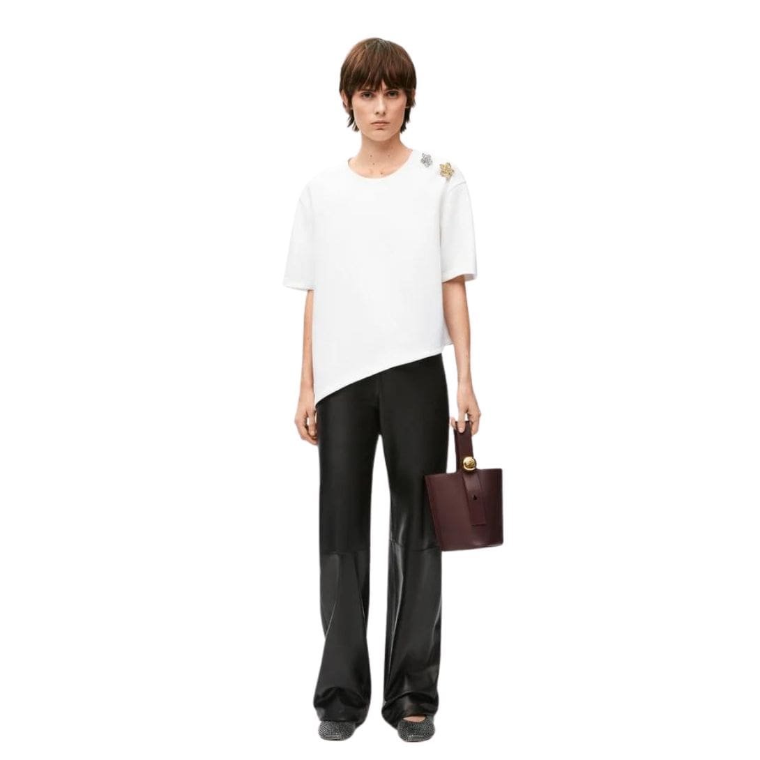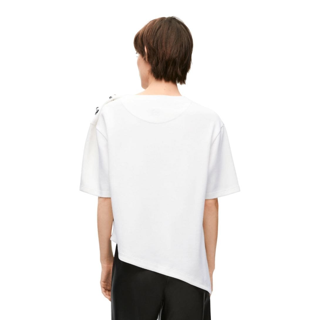 The Loewe Asymmetric Cotton Blend T-Shirt is designed to complement a range of outfits. Pair it with jeans or shorts for a relaxed weekend outing, or dress it up with trousers for a sophisticated appearance. Its clean lines and contemporary design make it a versatile addition to any wardrobe, suitable for both casual and semi-formal settings.