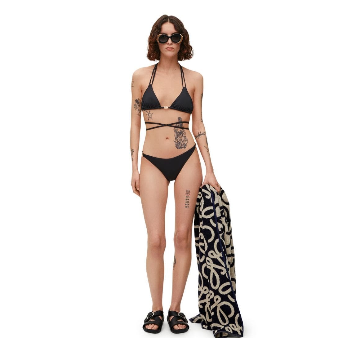 LOEWE’s design approach incorporates minimalist elegance with a focus on subtle yet sophisticated details. The bikini bottoms feature a sleek, streamlined silhouette that complements a variety of body types while offering a flattering fit. The color options are carefully selected to align with the brand’s aesthetic, providing a chic, understated look that is versatile enough for mixing and matching with other swimwear pieces.