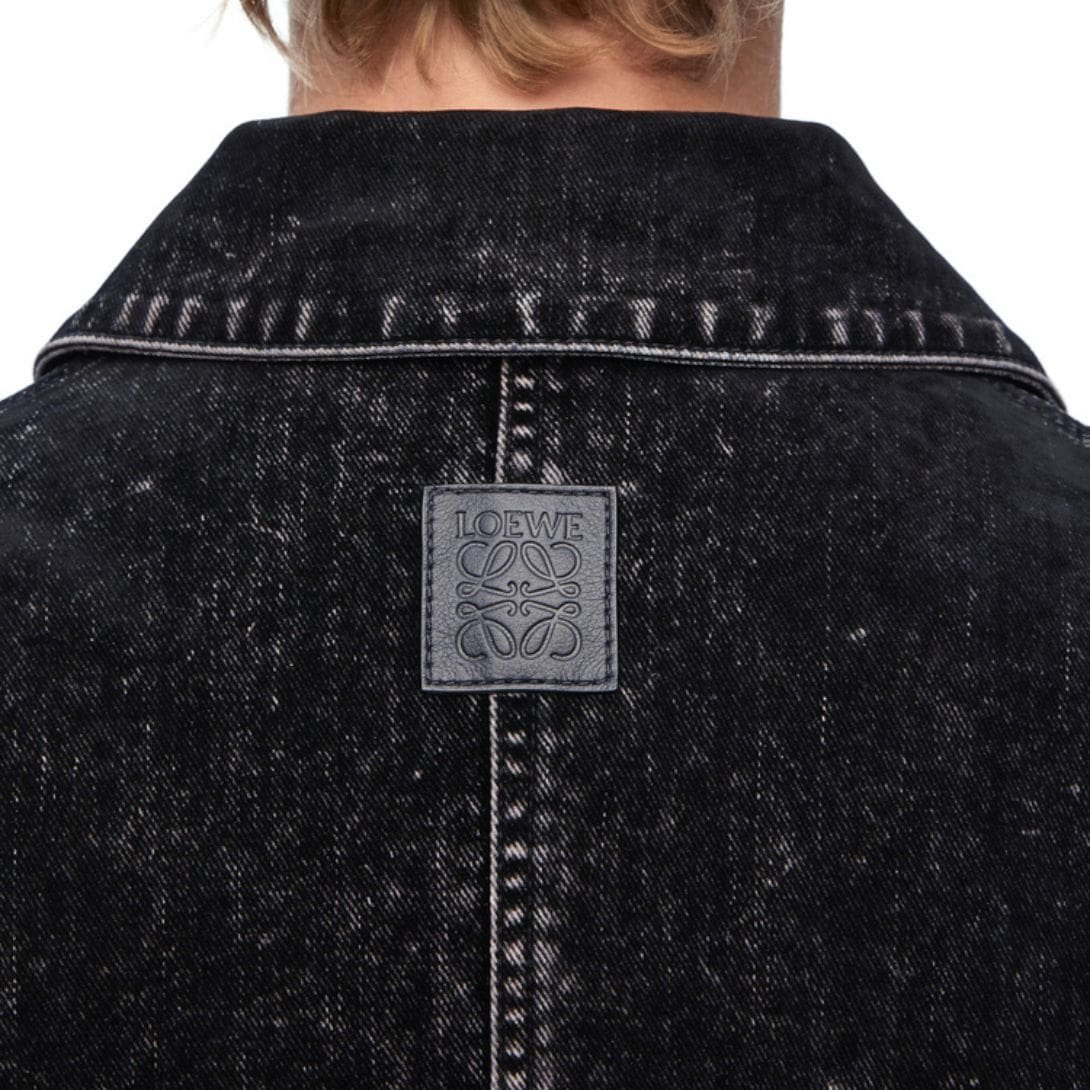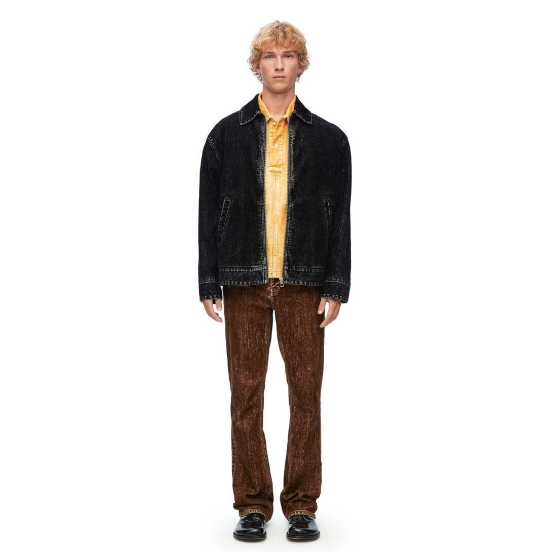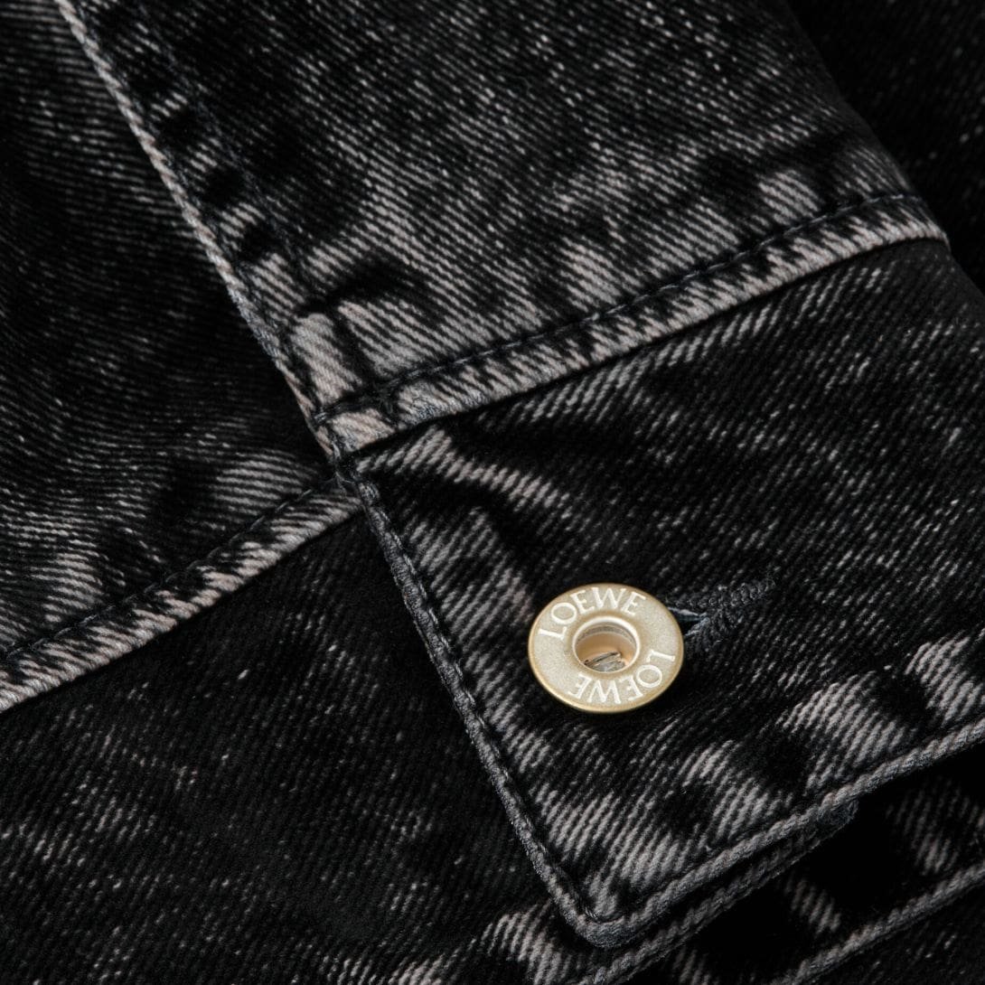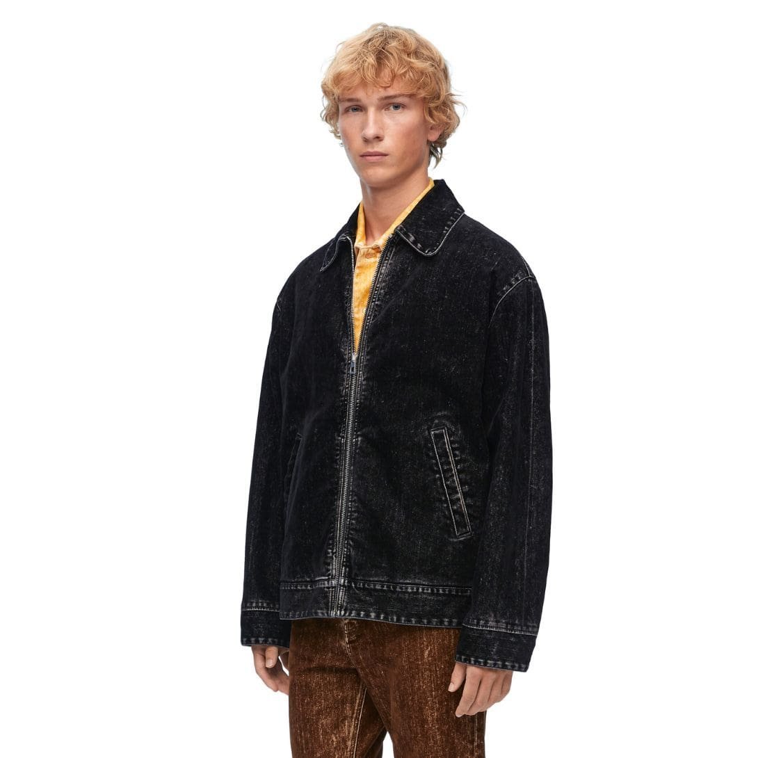 The design of the Loewe bomber jacket is characterized by its sleek lines and refined details. It features a zip front closure, ribbed cuffs, and a ribbed hem, all of which are signature elements of the bomber style. However, Loewe adds its own touch with subtle branding and carefully considered finishes that enhance the jacket’s overall aesthetic. The denim used in this bomber jacket is treated to achieve a rich, deep hue that complements a range of outfits, from casual to semi-formal.