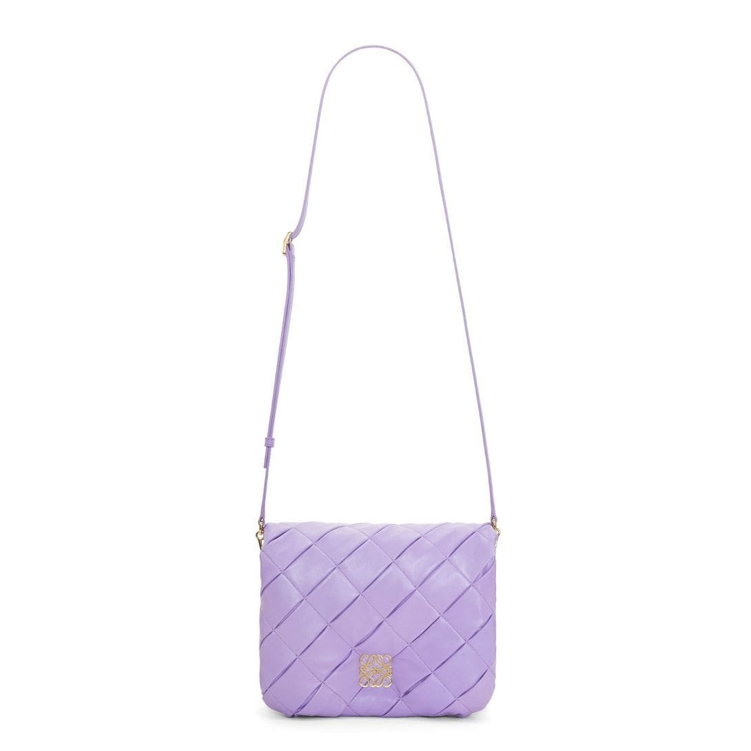 The LOEWE Goya Puffer Bag In Shiny Lambskin is a chic and sophisticated accessory, crafted from polished calf nappa leather. This premium material provides a sleek, shiny finish that exudes elegance and durability, making it a standout piece in any wardrobe.