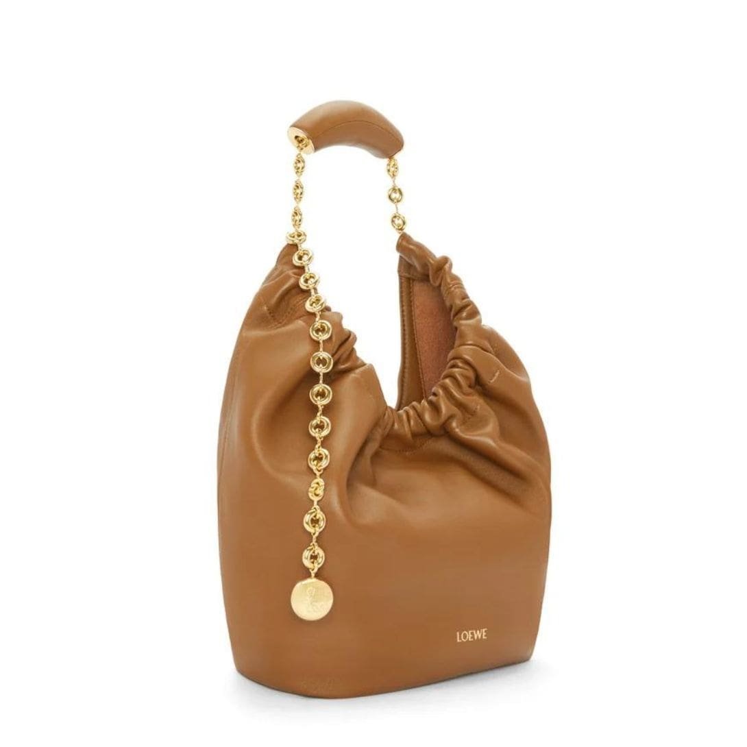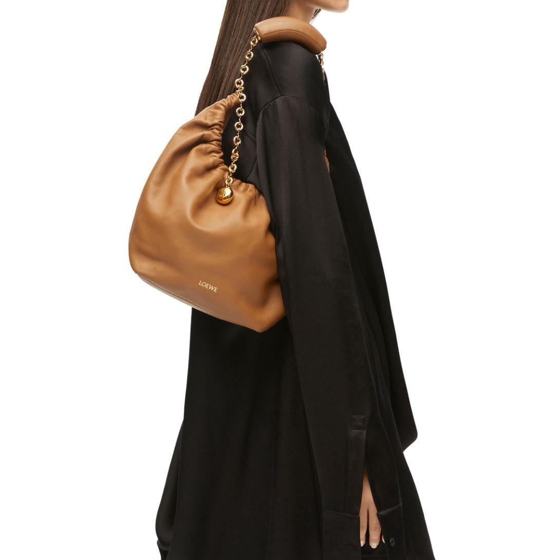 Introducing the luxurious LOEWE Small Squeeze Bag In Lambskin, meticulously crafted from soft lamb nappa, ensuring a plush touch and refined appearance. Its shoulder strap, measuring 20 cm, provides a versatile length, offering comfortable wear with a strap drop ranging from 28 to 54 cm. Additionally, the handle, spanning 48 to 100 cm, offers alternative carrying options for added convenience.