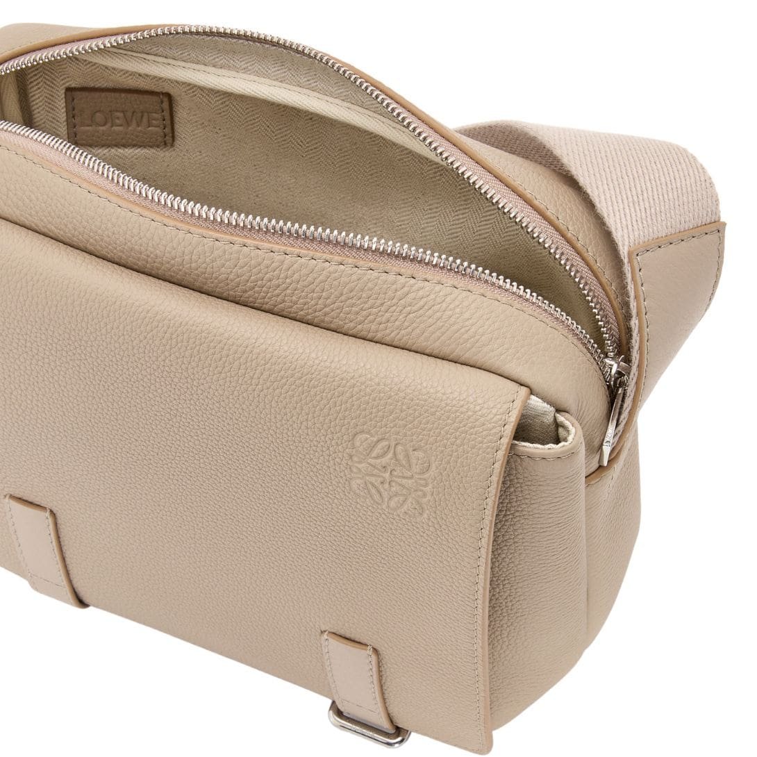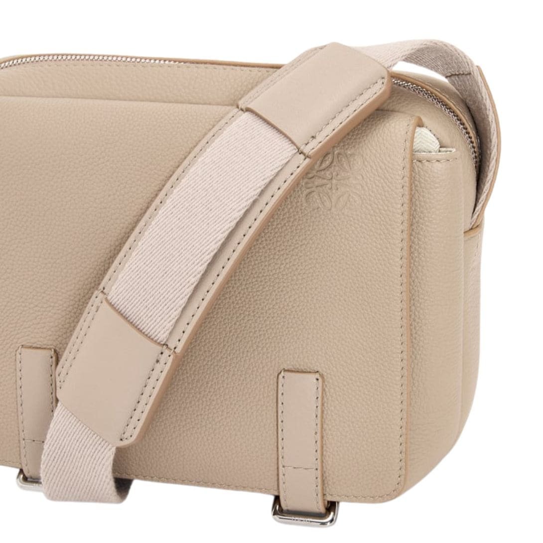 Overall, the LOEWE XS Military Messenger Bag in Soft Grained Calfskin exemplifies the brand’s commitment to quality and design. Its combination of luxurious materials, elegant metallic accents, and practical features makes it a standout accessory for those seeking both sophistication and functionality in their daily carry.