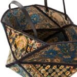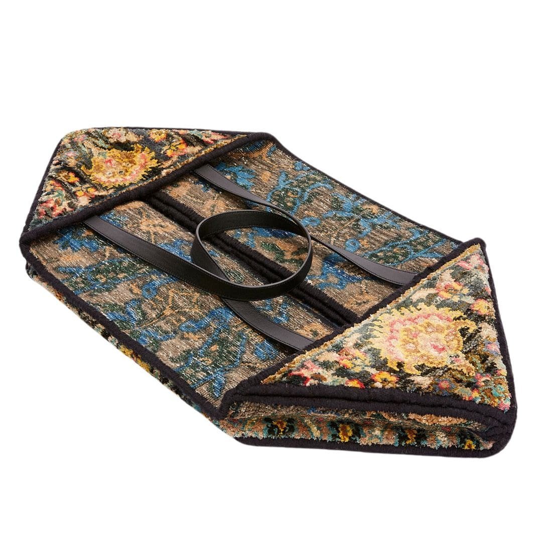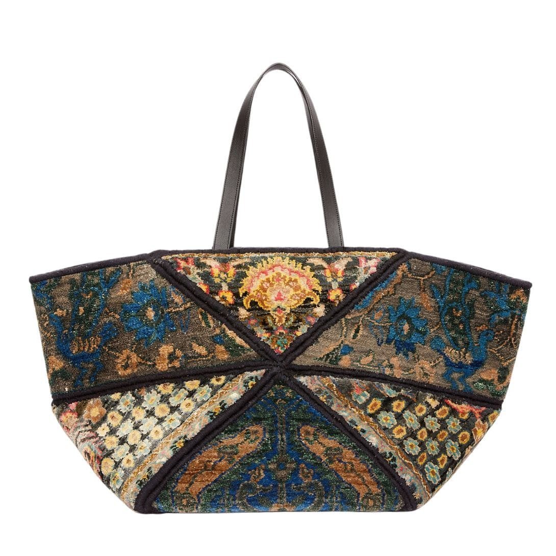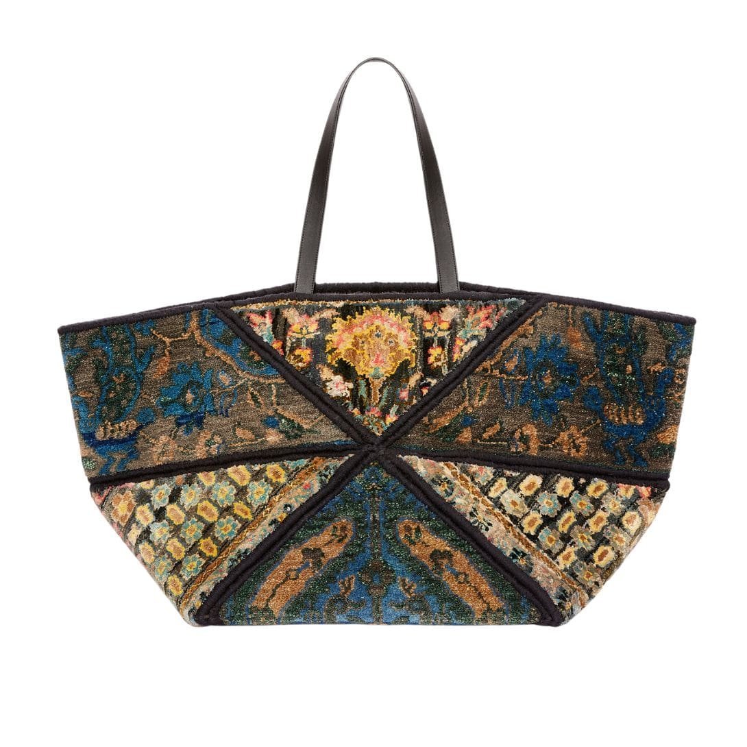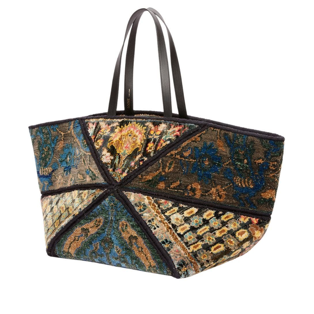 The Loewe XXL Carpet Puzzle Fold Tote in silk and wool is a standout piece, blending luxury and artistry with a practical design. Crafted from a unique combination of silk and wool fabric, this tote showcases a vibrant multicolor pattern that captures attention. The fabric composition not only provides a luxurious feel but also ensures durability, making it suitable for everyday use.