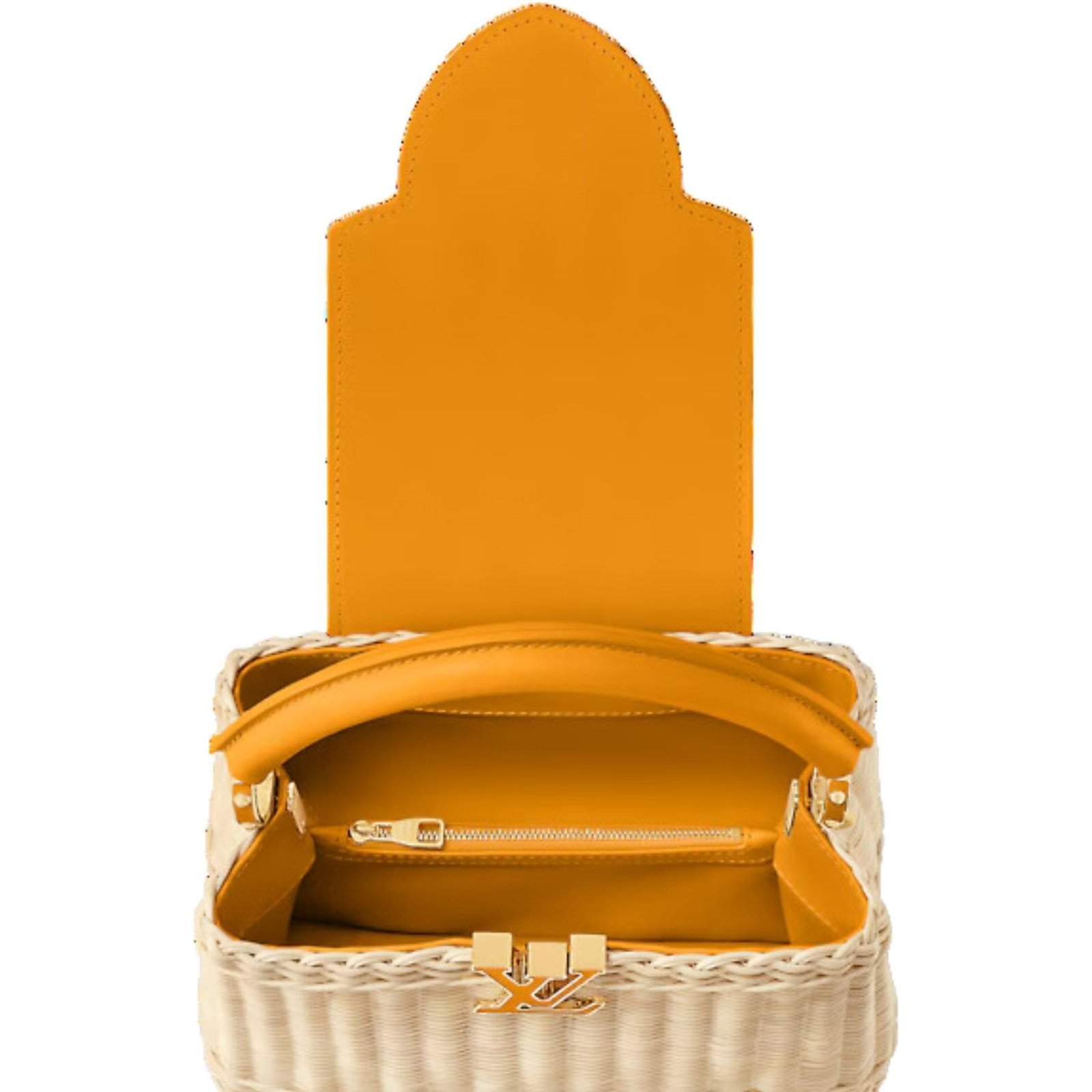 Introducing the timeless elegance of the LOUIS VUITTON CAPUCIINES BB handbag, reminiscent of Louis Vuitton’s iconic Picnic Trunk from 1892. Crafted with meticulous attention to detail, this exquisite piece features a body crafted from braided rattan, accentuated with cowhide leather on the top handle and flap. The hardware, including the iconic LV Initials, gleams in a golden hue, adding a touch of opulence to the design.