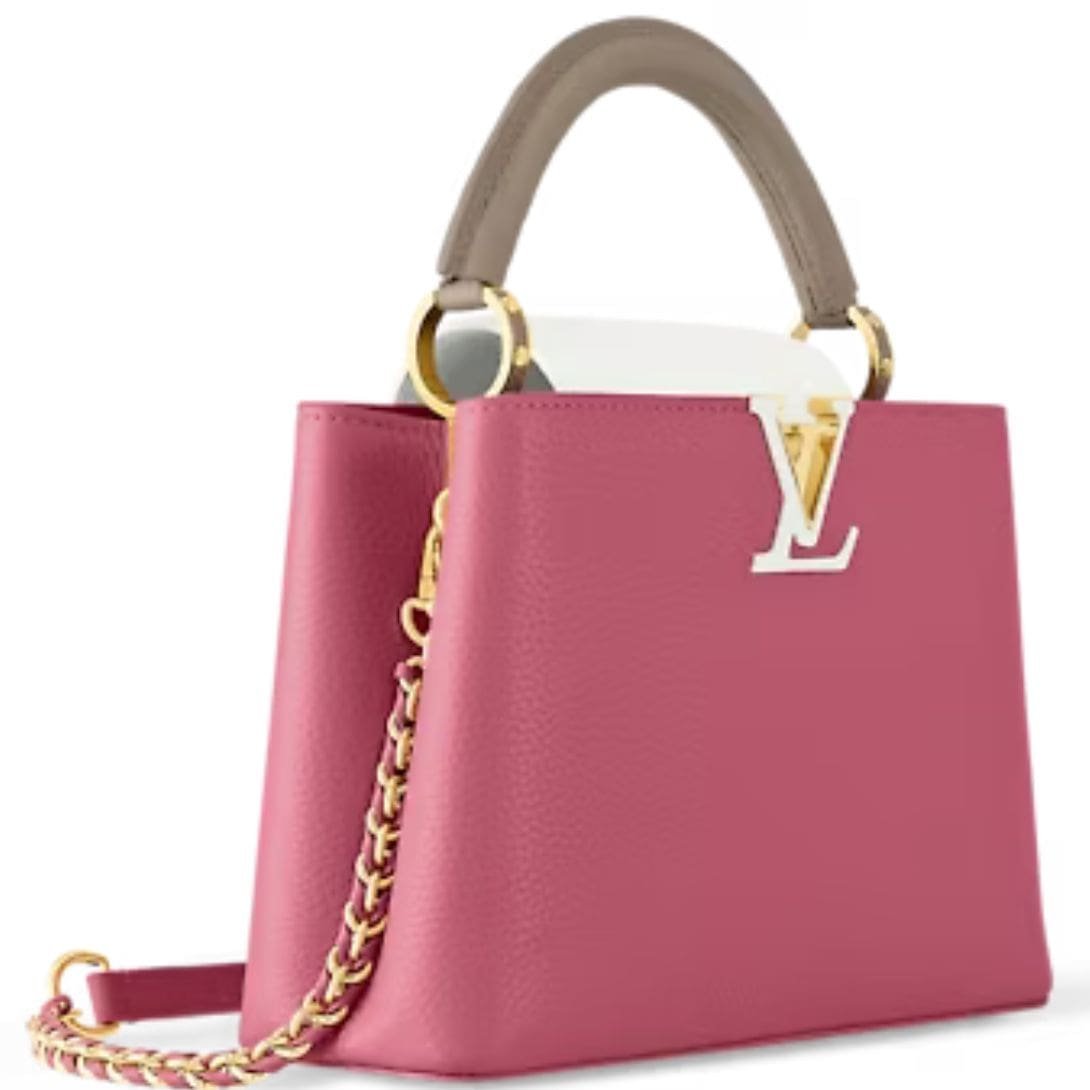 The trio of Rose Asnieres Pink, Snow White, and Galet Gray on full-grain Taurillon leather creates a striking visual impact, while the braided chain strap adds a touch of sophistication. Whether you choose to carry it with the flap outside or tucked into the bag, the Capucines adapt effortlessly to your style.