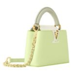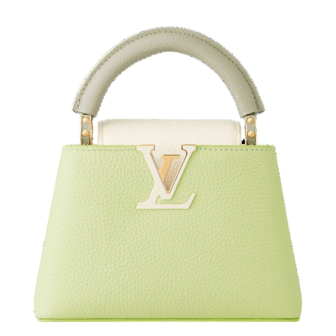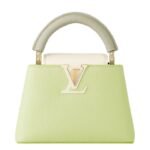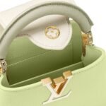 Embrace elegance with a burst of joy through the LOUIS VUITTON CAPUCINES MINI handbag. This stunning accessory, crafted from luxurious Taurillon leather, features a vibrant color block design in shades of Vert Noto Green and Milky White, complemented by Vert Asnieres Green. The top handle and flap, highlighted in contrasting colors, breathe fresh life into this classic silhouette.