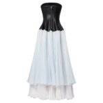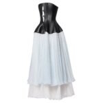 Louis vuitton Corset Top Tiered Dress captures the rebellious and romantic essence of Nicolas Ghesquière’s signature runway style. The top features a graphic, figure-hugging corset silhouette made from supple lambskin, adorned with ornate jewel buttons that add a touch of opulence. The tiered silk georgette skirt contrasts beautifully, introducing airy volume and a play of tones that enhance the dress’s dynamic look. For added versatility, the dress includes removable suspenders, allowing for multiple styling options.