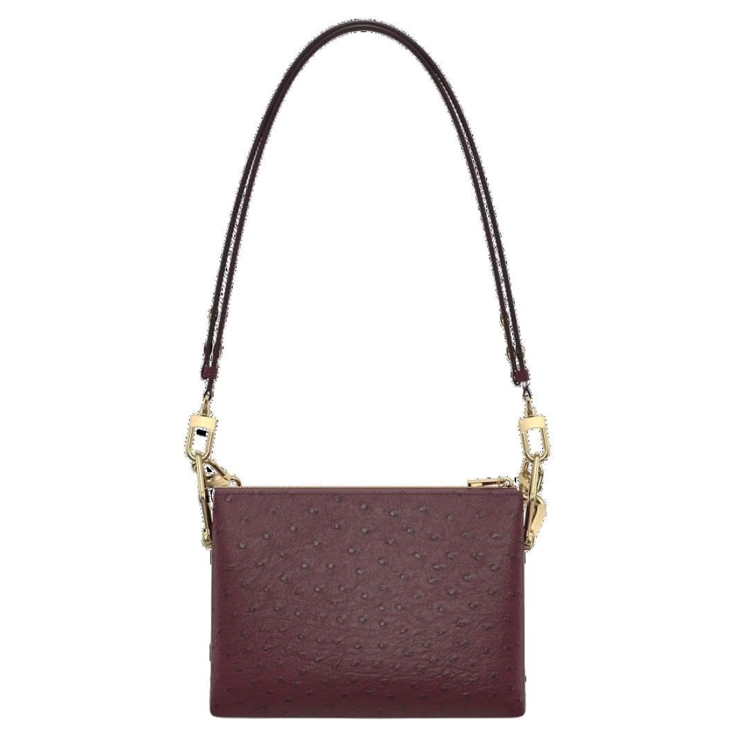 The Bordeaux hue of the ostrich leather, complemented by ostrich leather trim, evokes the richness and fullness of great Bordeaux vintages, adding a touch of sophistication to every ensemble. The goatskin lining ensures a luxurious feel, while the gold color hardware adds a hint of opulence.