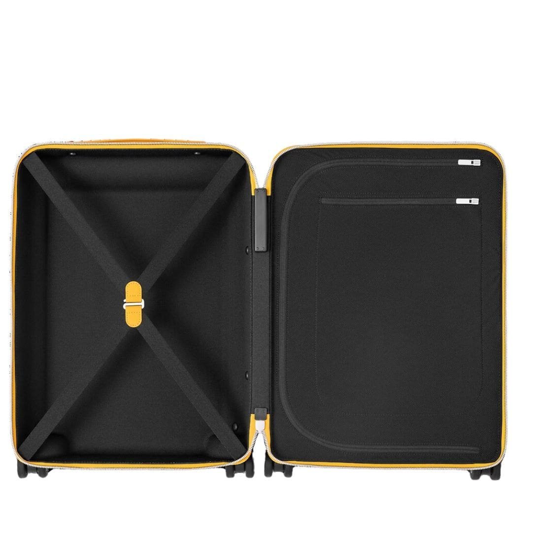 The interior is thoughtfully appointed with textile lining, elastic straps, and a divider with a pocket, keeping your belongings organized during transit. Top and side leather handles provide convenience, while the four compact wheels ensure effortless maneuverability through bustling terminals and city streets alike.