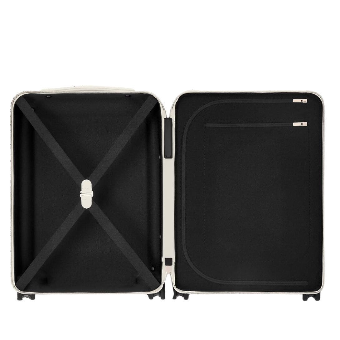 Experience seamless travel with the extra-wide cane handle and four compact double wheels, ensuring effortless navigation through bustling terminals and city streets. The interior, adorned with textile lining, elastic straps, and a divider with a pocket, keeps your belongings organized and secure throughout your journey.