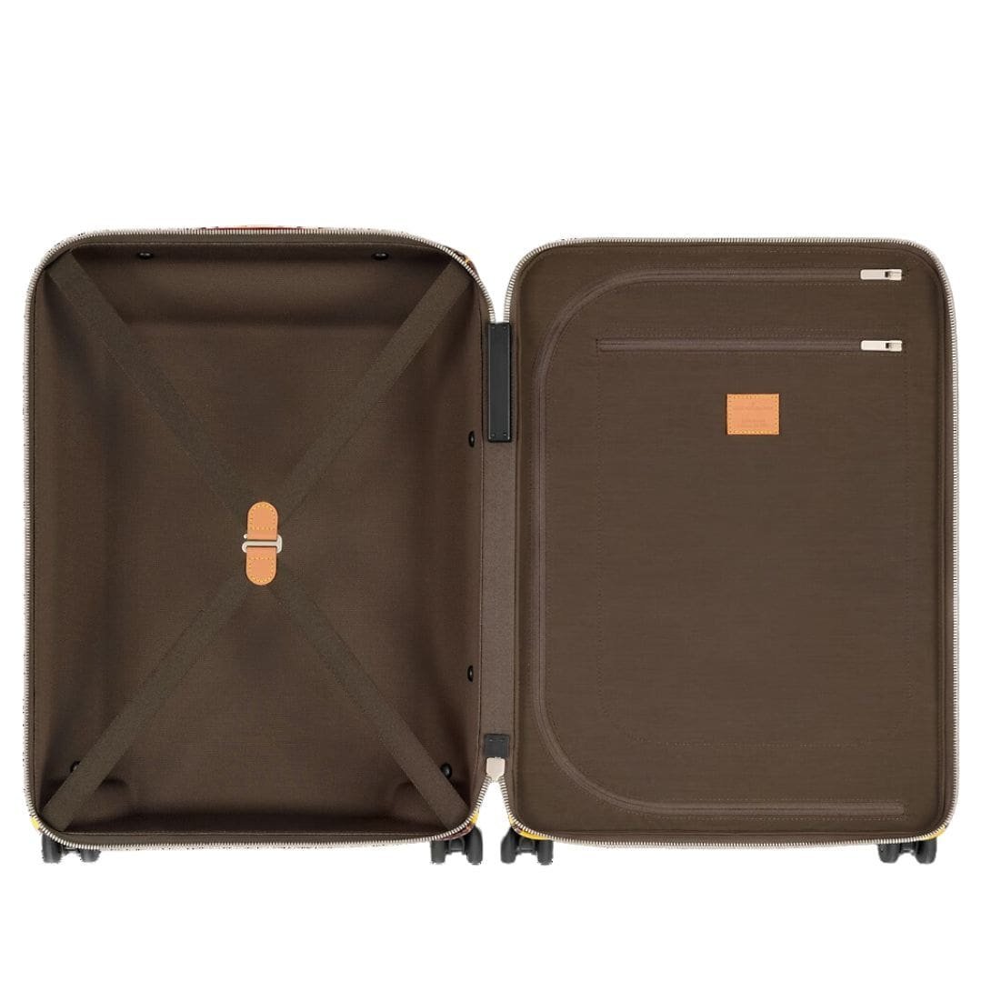 Measuring 15 x 21.7 x 8.3 inches, this cabin-sized marvel boasts a cheerful yellow hue, accentuated by natural cowhide leather trim and champagne hardware, exuding an aura of understated elegance. The flat-bottomed interior, facilitated by the wide external cane, offers ample space for your belongings, while the elastic straps and divider with pocket ensure optimal organization throughout your journey.
