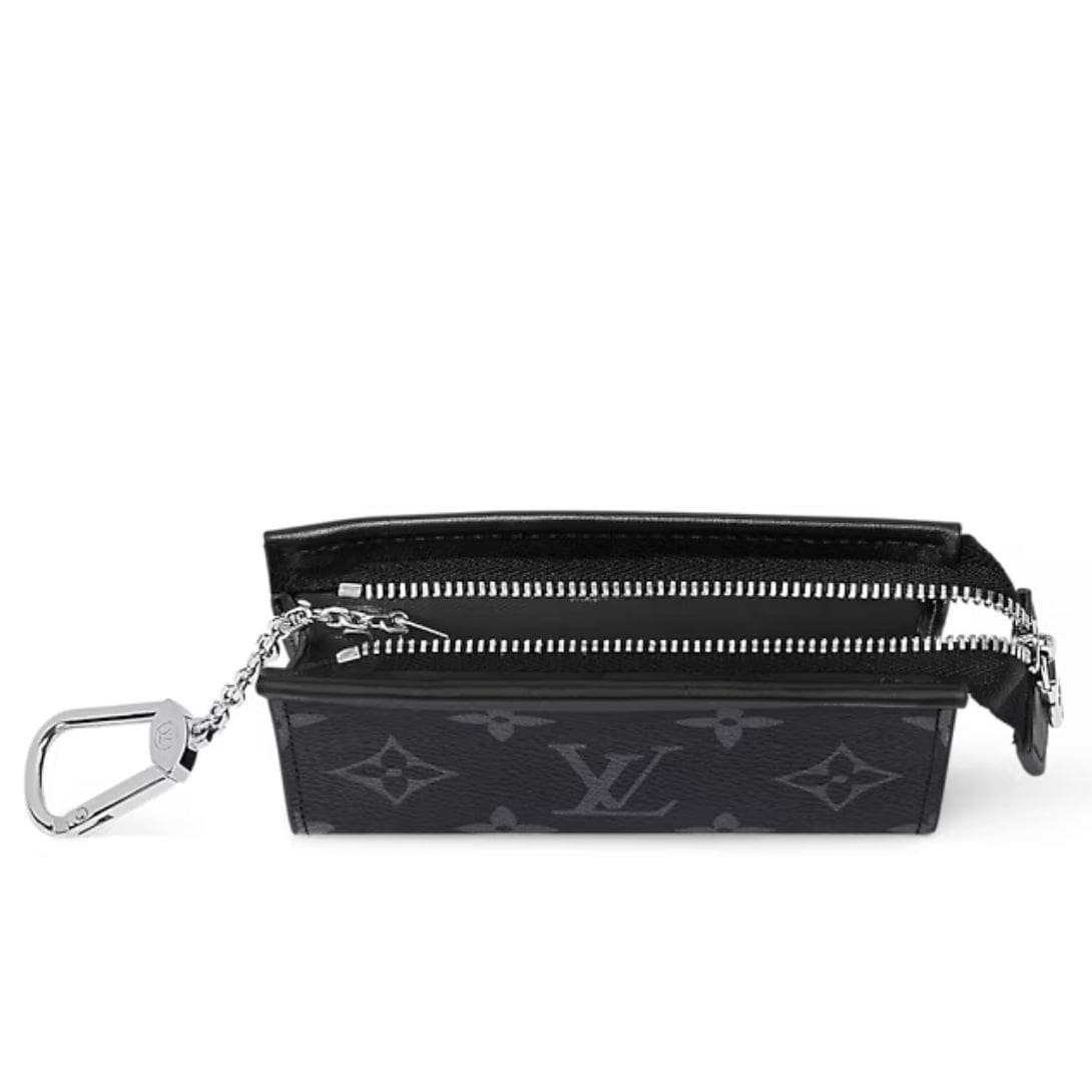 Measuring 4.7 x 3 x 1.2 inches (length x height x width), the LOUIS VUITTON KEY POUCH VOYAGE combines the durability of Monogram Eclipse coated canvas with the luxurious touch of cowhide leather. The textile lining adds an extra layer of protection, while the palladium-color hardware enhances its modern aesthetic. This versatile pouch is perfect for everyday use, providing a compact and secure way to carry your small essentials.