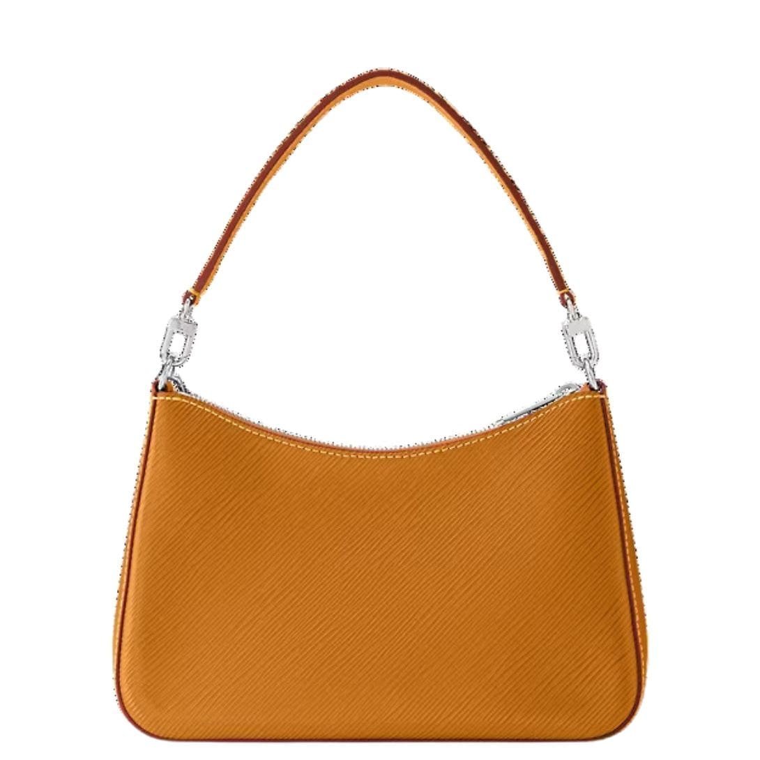 Measuring 9.8 x 5.9 x 3.1 inches, the LOUIS VUITTON MARELLE handbag is perfectly proportioned for everyday wear, offering both style and functionality. The rich Honey Gold hue adds warmth to its sleek silhouette, while the Epi-grained cowhide leather and smooth cowhide leather and canvas trim exude sophistication.