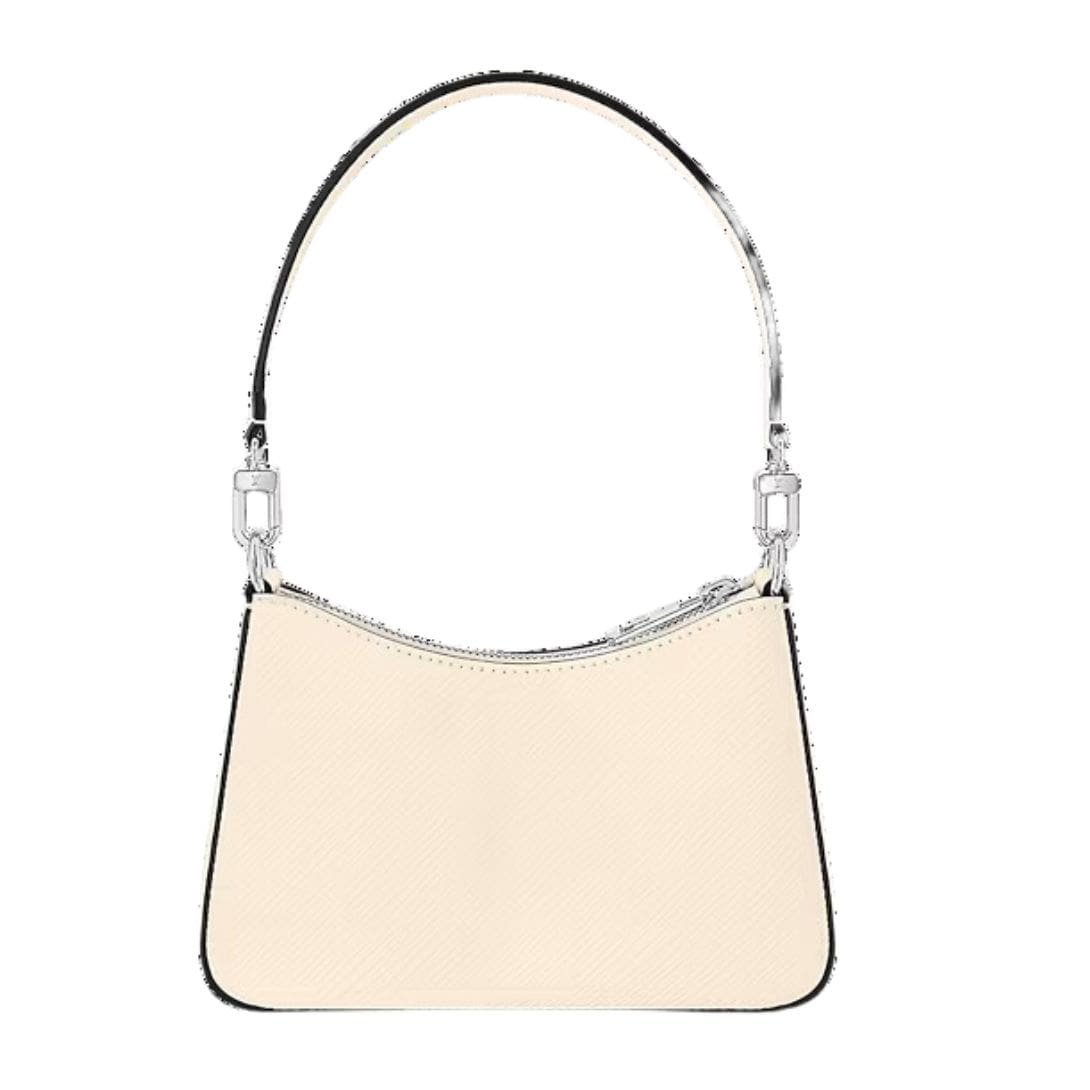 Measuring 7.5 x 5.3 x 2.6 inches, the LOUIS VUITTON MERELLINI handbag is perfectly proportioned for everyday wear, offering both style and functionality. The elegant Quartz White hue adds a touch of refinement, while the Epi-grained cowhide leather and smooth cowhide leather trim ensure durability and luxury.