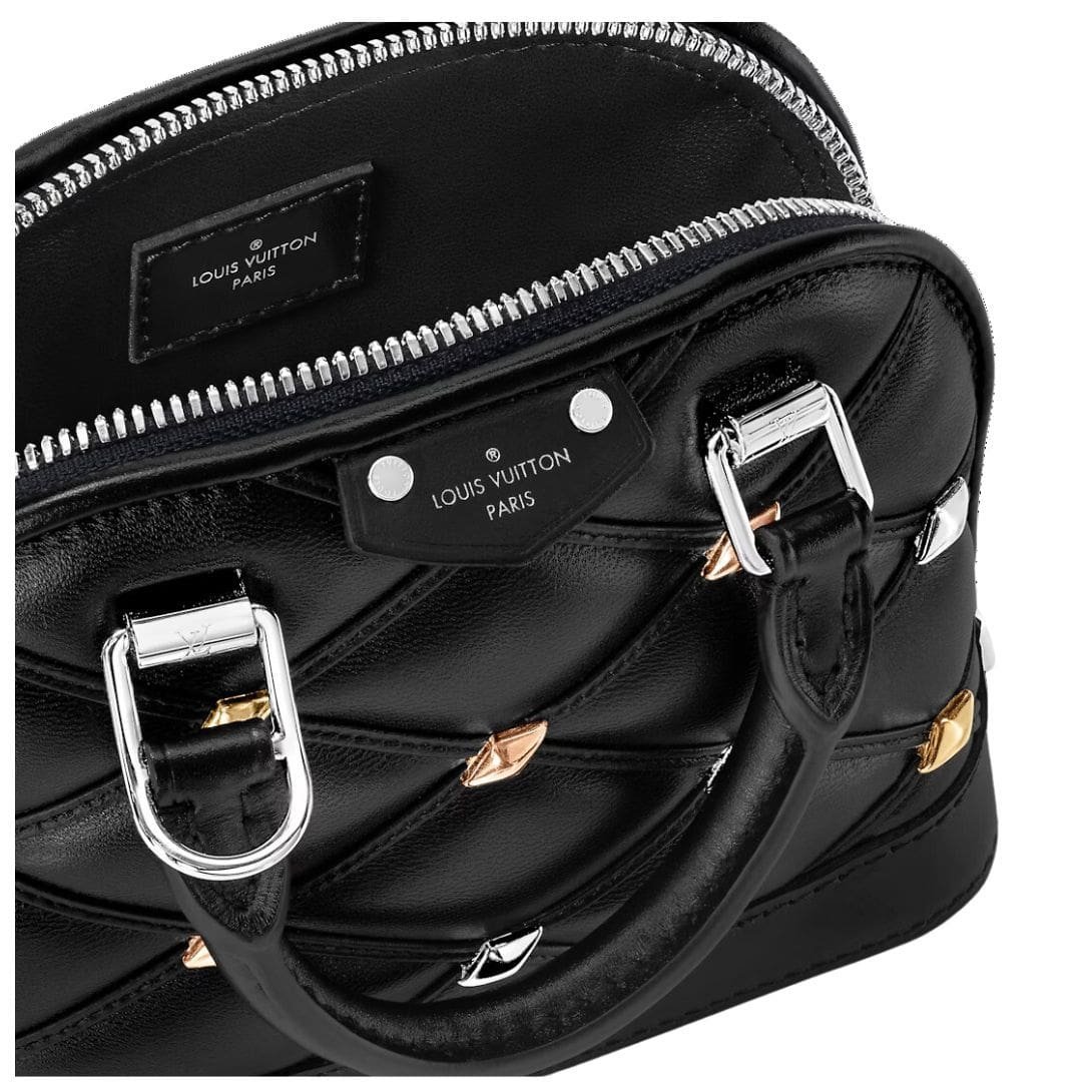 Measuring a petite 7.1 x 4.7 x 3.1 inches, the LOUIS VUITTON NANO ALMA exudes understated glamour in classic black, complemented by lambskin trim and opulent gold and silver-color hardware. The meticulous attention to detail is further enhanced by tiny studs in gold- and silver-tone metal, adding a subtle yet captivating allure to the bag.
