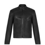 The model, wearing size FR 50, exemplifies the jacket’s flattering fit, with measurements of 36 inches in the chest and a height of 6 feet 2.5 inches. This biker jacket is designed to create a sharp silhouette when paired with other black pieces from the collection, making it a versatile and stylish addition to any wardrobe.