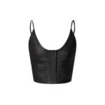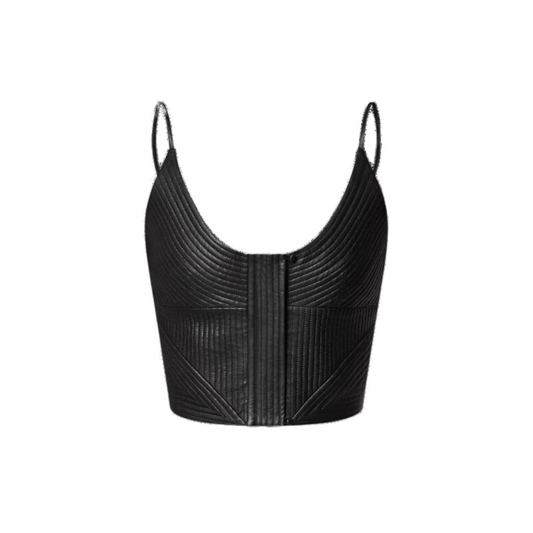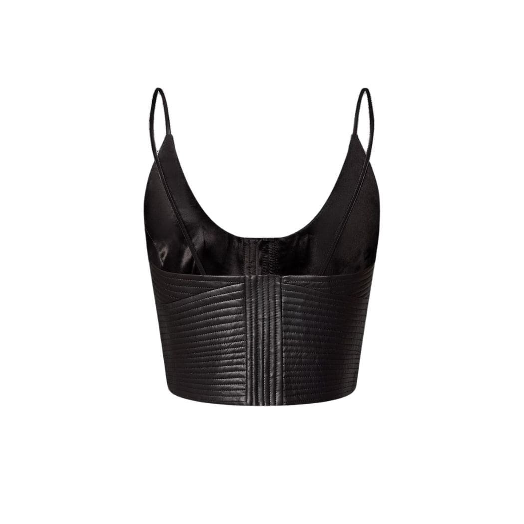 The design is enhanced by pinstripe topstitching at various angles, introducing subtle texture and visual interest to the sleek black leather. This detail adds a refined touch to the otherwise bold garment, making it suitable for a variety of looks. The hidden zipper fastening at the front ensures a clean, seamless finish, maintaining the camisole’s streamlined appearance.