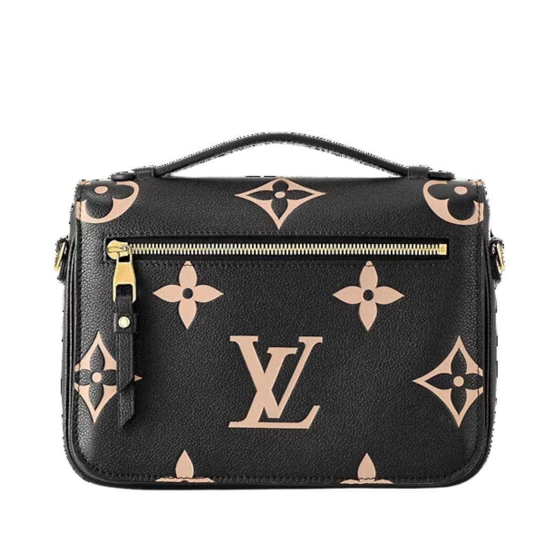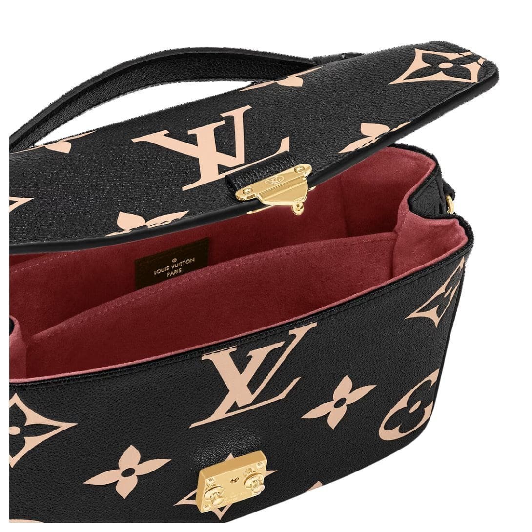 Measuring 9.8 x 7.5 x 2.8 inches, the Pochette Metis epitomizes versatility and style in classic black/beige, complemented by grained cowhide leather trim and gold-color hardware, adding a hint of luxury to the design. The microfiber lining enhances its refined aesthetic, while the outside zipped pocket ensures easy access to your essentials on the go.