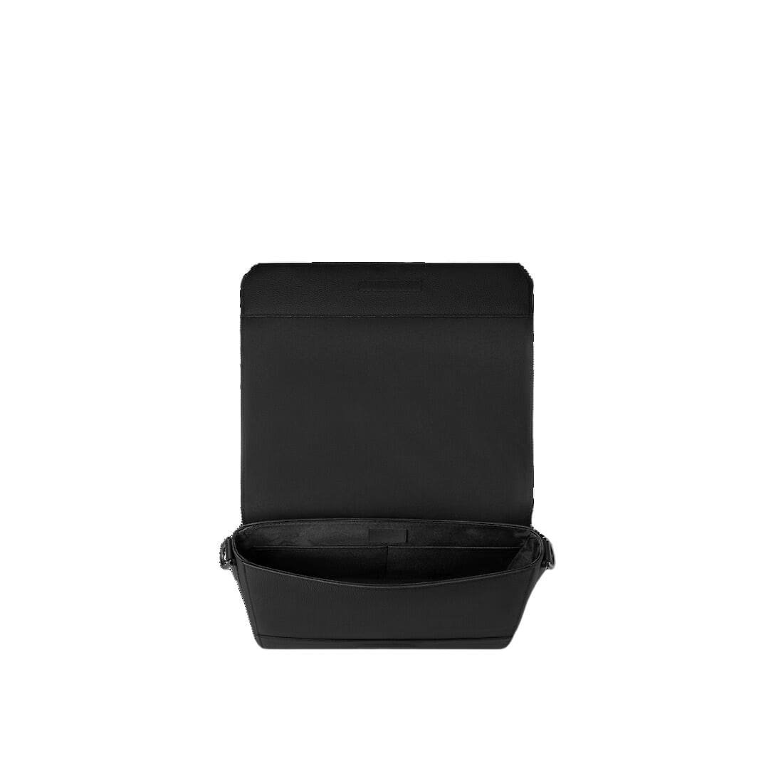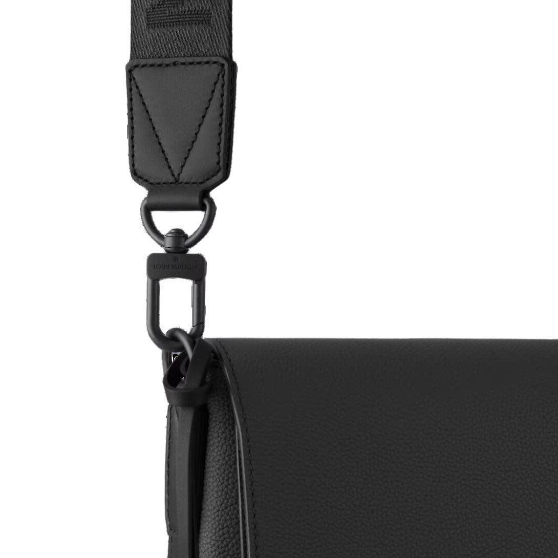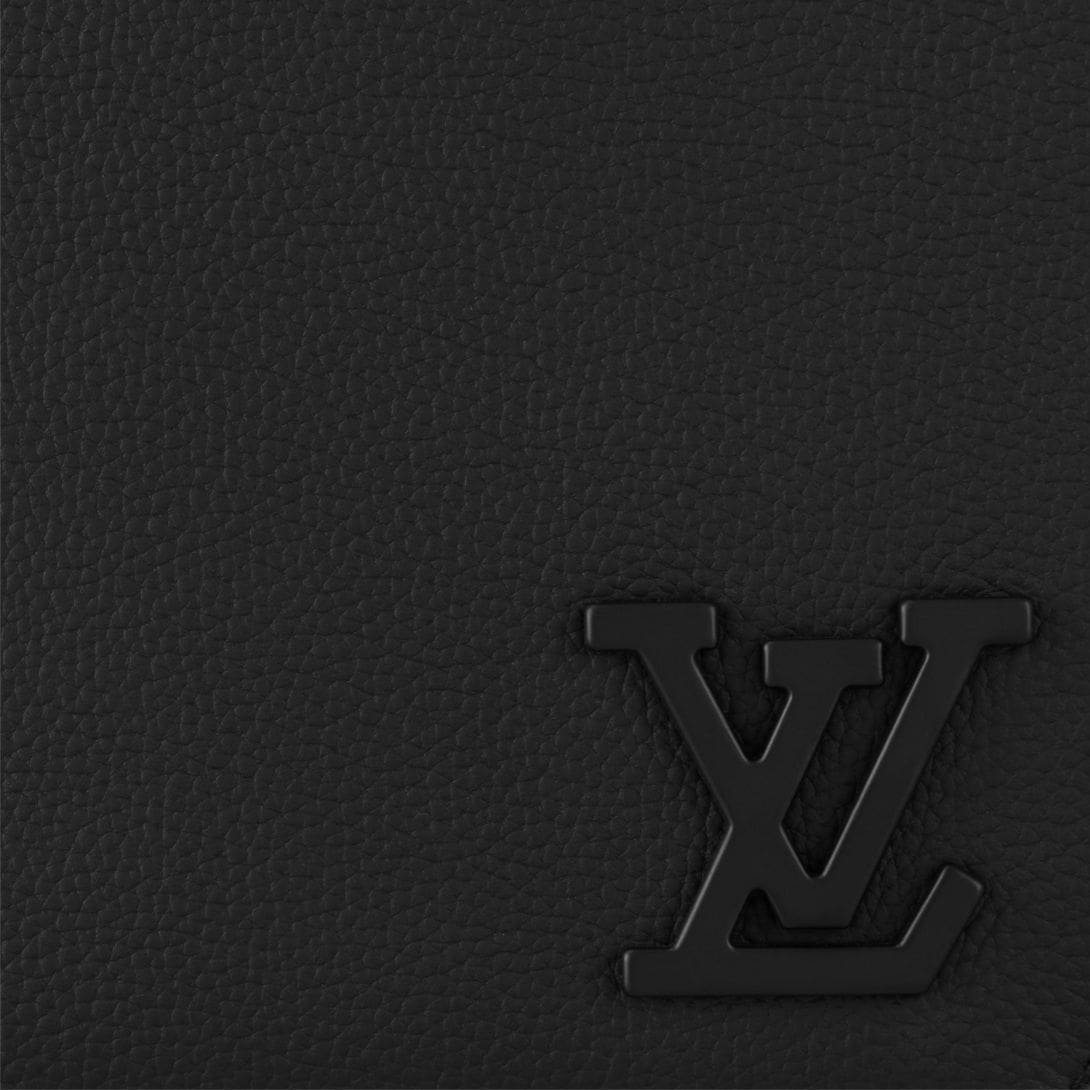 Measuring 11 x 9.4 x 3.9 inches, this LOUIS VUITTON TAKEOFF MESSENGER boasts a sleek silhouette enhanced by black-grained calf leather and cowhide leather trim. The textile lining and black hardware complement its sophisticated aesthetic. Inside, the main compartment with a magnetic flap closure houses two flat pockets, offering organized storage options.