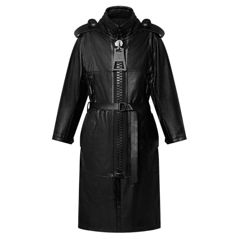 In summary, the Louis Vuitton XXL Zipper Leather Coat is a masterful blend of classic and contemporary design elements. The supple grained calf leather, oversized epaulettes, and dramatic XXL zipper create a bold and stylish piece that stands out. The slim belt and regular fit ensure it flatters the figure, making it a perfect addition to any fashion-forward wardrobe. This coat not only makes a statement but also offers the quality and craftsmanship synonymous with the Louis Vuitton name.