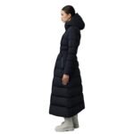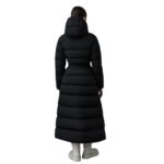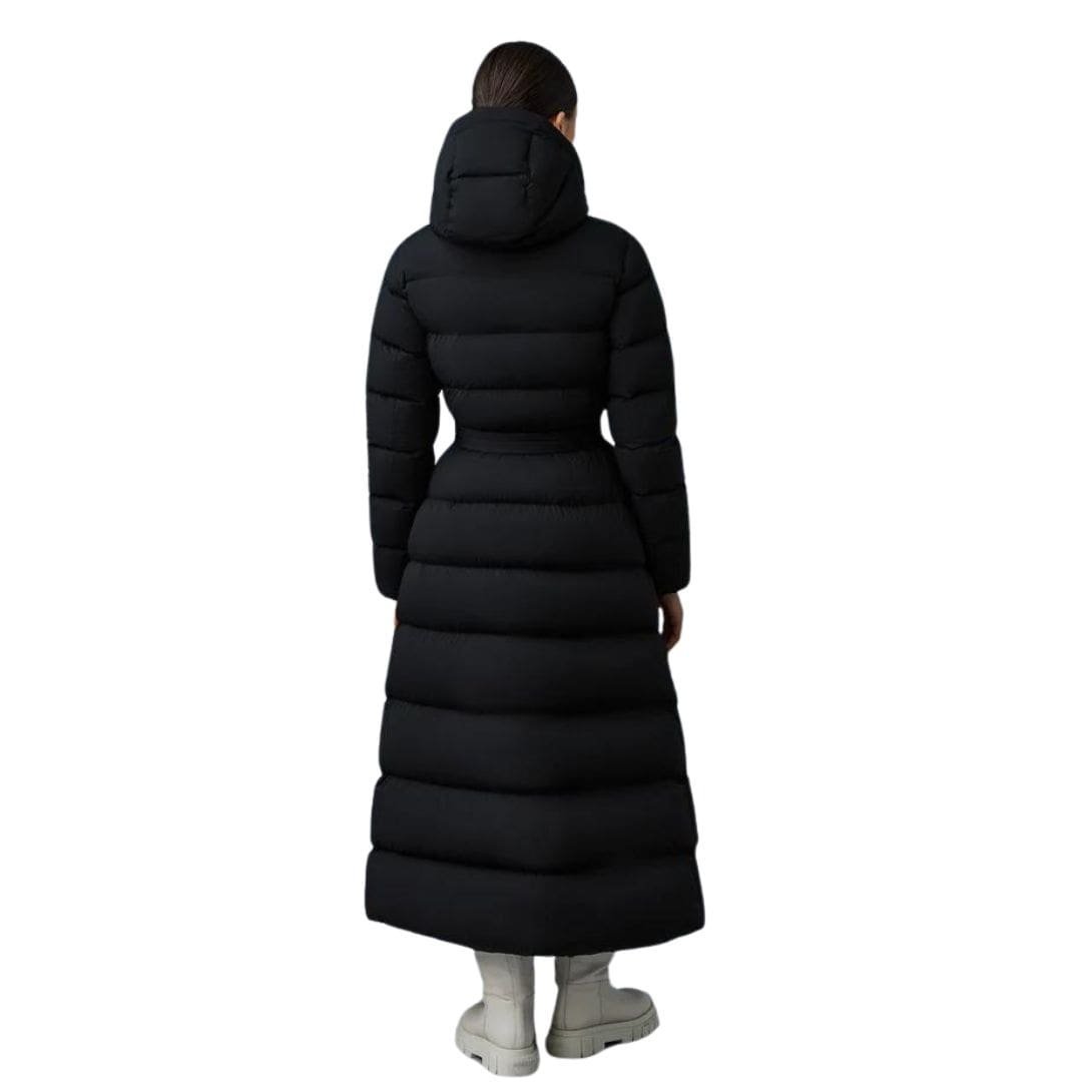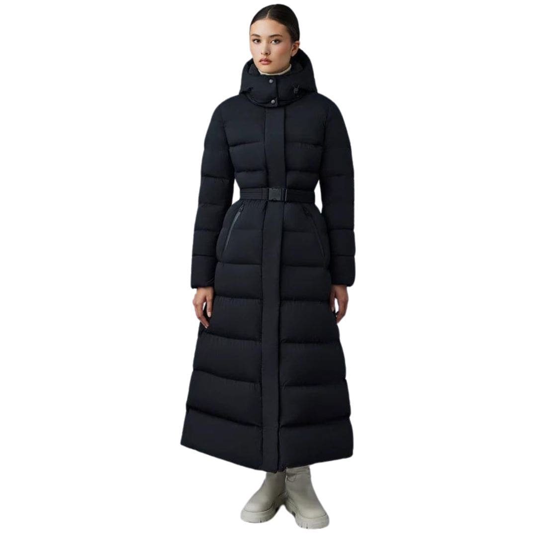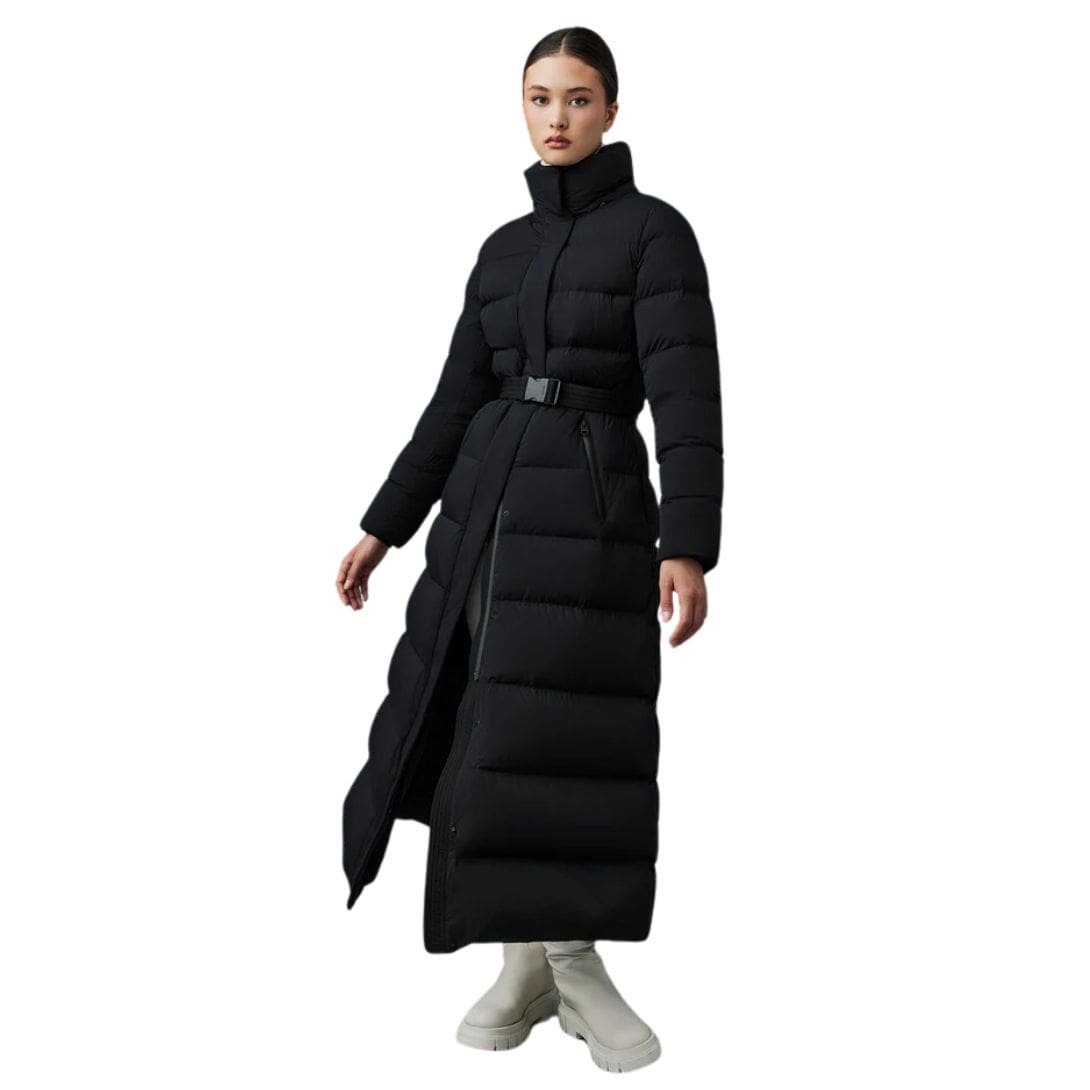 Mackage Calina-City Stretch Light Down Maxi Coat made from recycled light down, offering a sleek, close-to-body fit. This coat features a press-release fastening belt that enhances its silhouette, along with a storm visor hood for extra protection against harsh weather. Its lightweight design is complemented by box quilting, a pillow collar, and rib-knit storm cuffs to keep you warm and comfortable.
