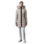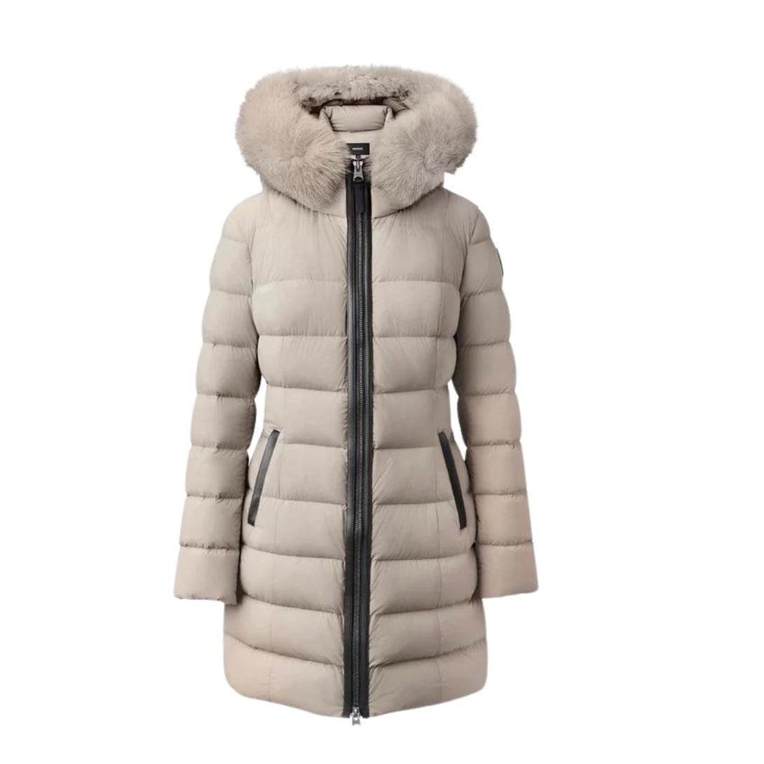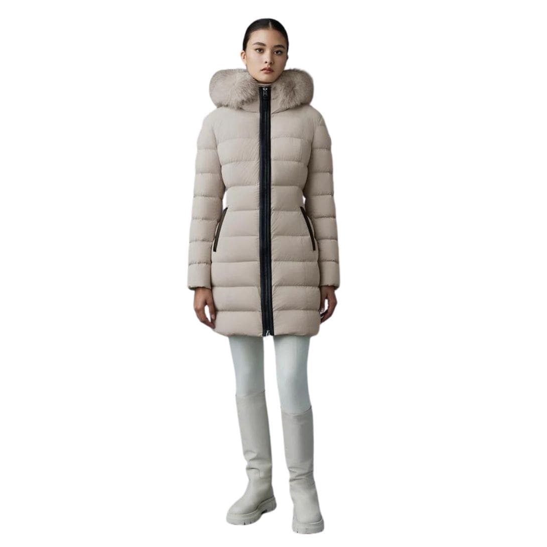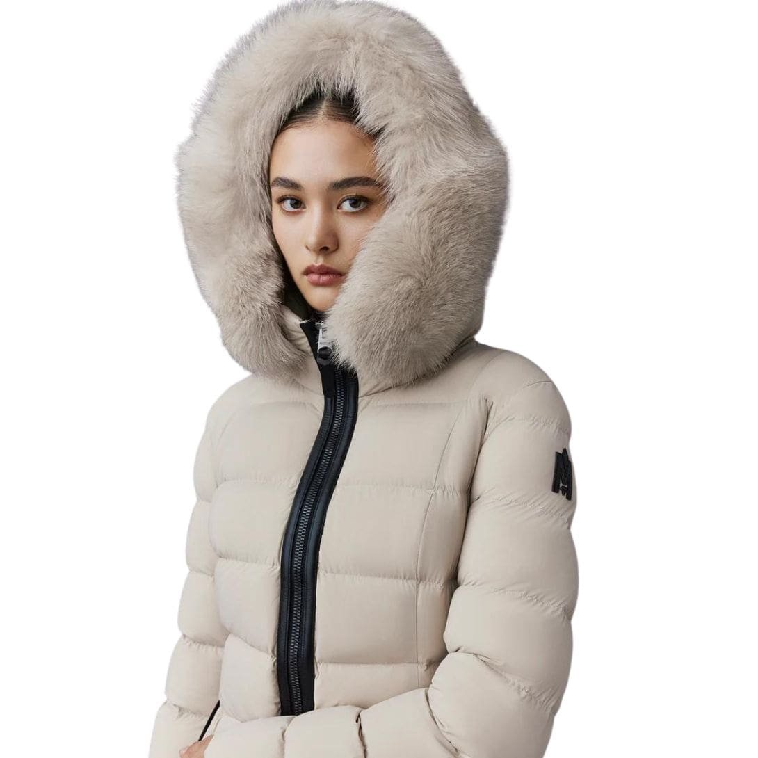 The Mackage Calla Agile-360 Stretch Light Down Coat with Blue Fox Fur Collar is designed with our exclusive Agile 360 stretch shell and features a removable blue fox fur trim around the hood. This meticulously tailored coat offers a fitted silhouette, enhancing comfort and freedom of movement. It is water-resistant and repellent, and includes an adjustable drawcord hood and insulated pockets, making it an elegant and versatile choice for elevated styling.