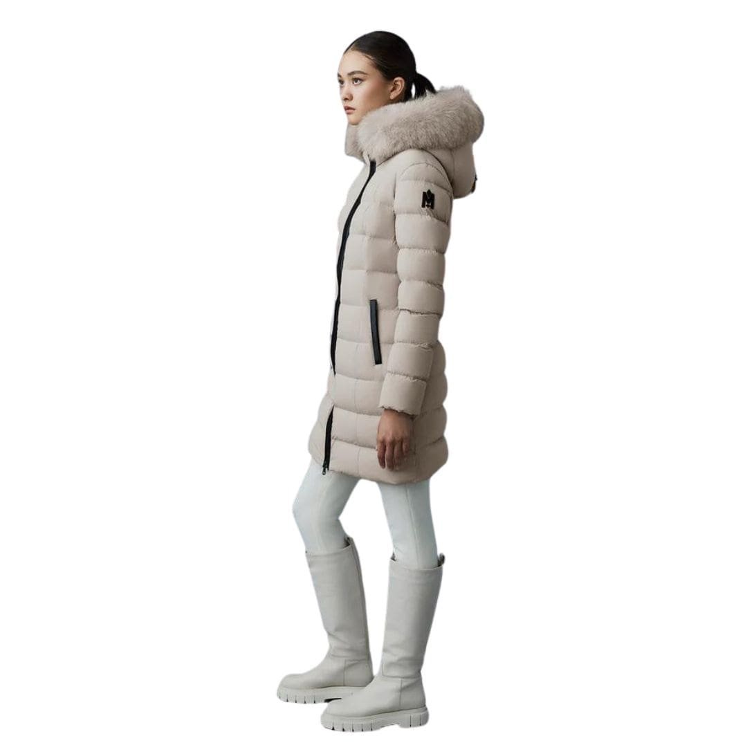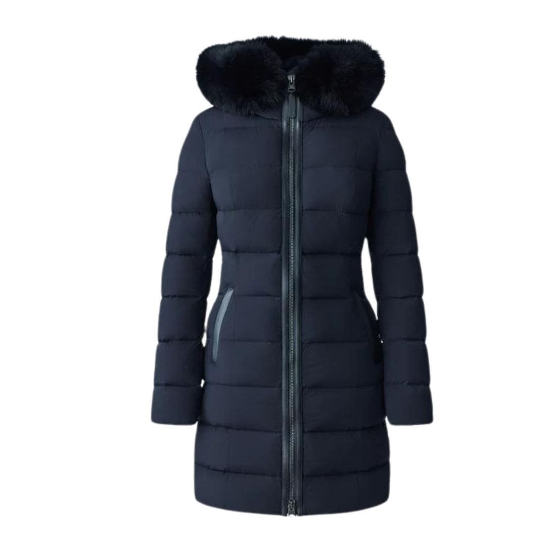 MACKAGE FCALLA AGILE-360 STRETCH LIGHT DOWN COAT WITH BLUE FOX FUR COLLAR