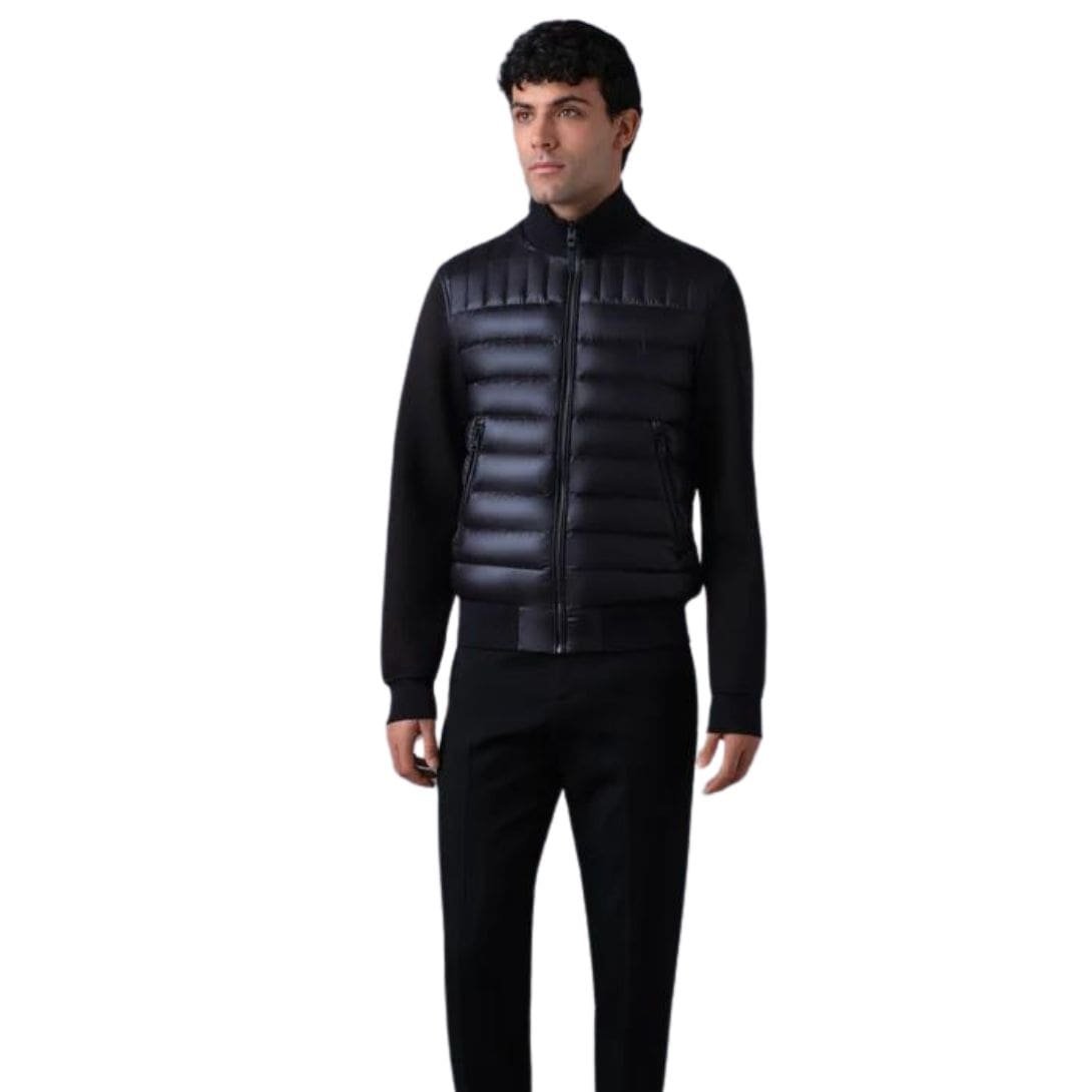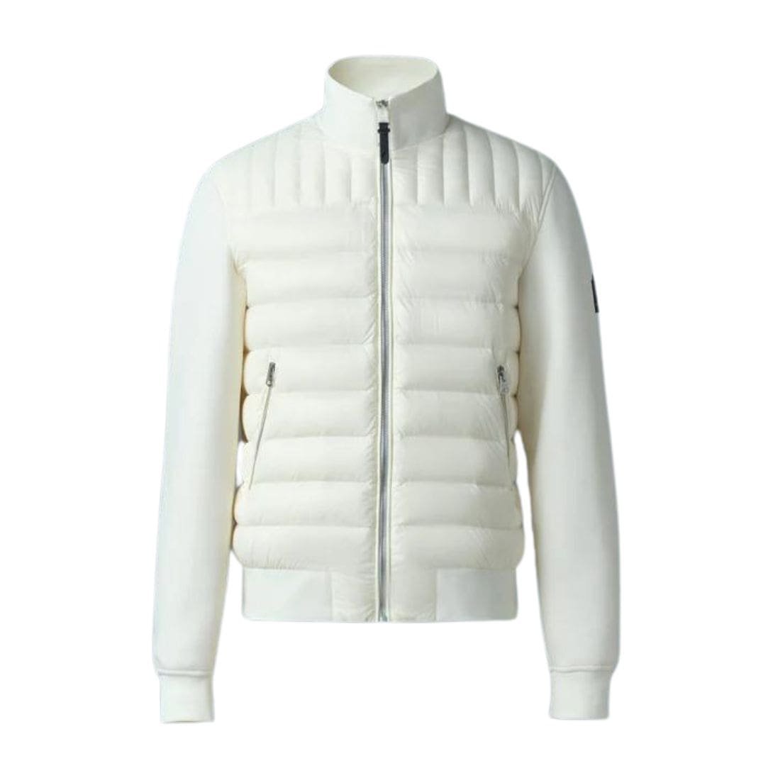 Introducing the Mackage Collin-R Nano Down Mixed Media Bomber Jacket is a transitional jacket for men featuring a classic bomber style. Meticulously tailored to a slim fit, it showcases a recycled lustrous nano down front complemented by soft double-face jersey sleeves and back. The rib knit stand collar and trims provide both tactical detailing and warmth, making it a contemporary multi-seasonal layer with effortless elegance.