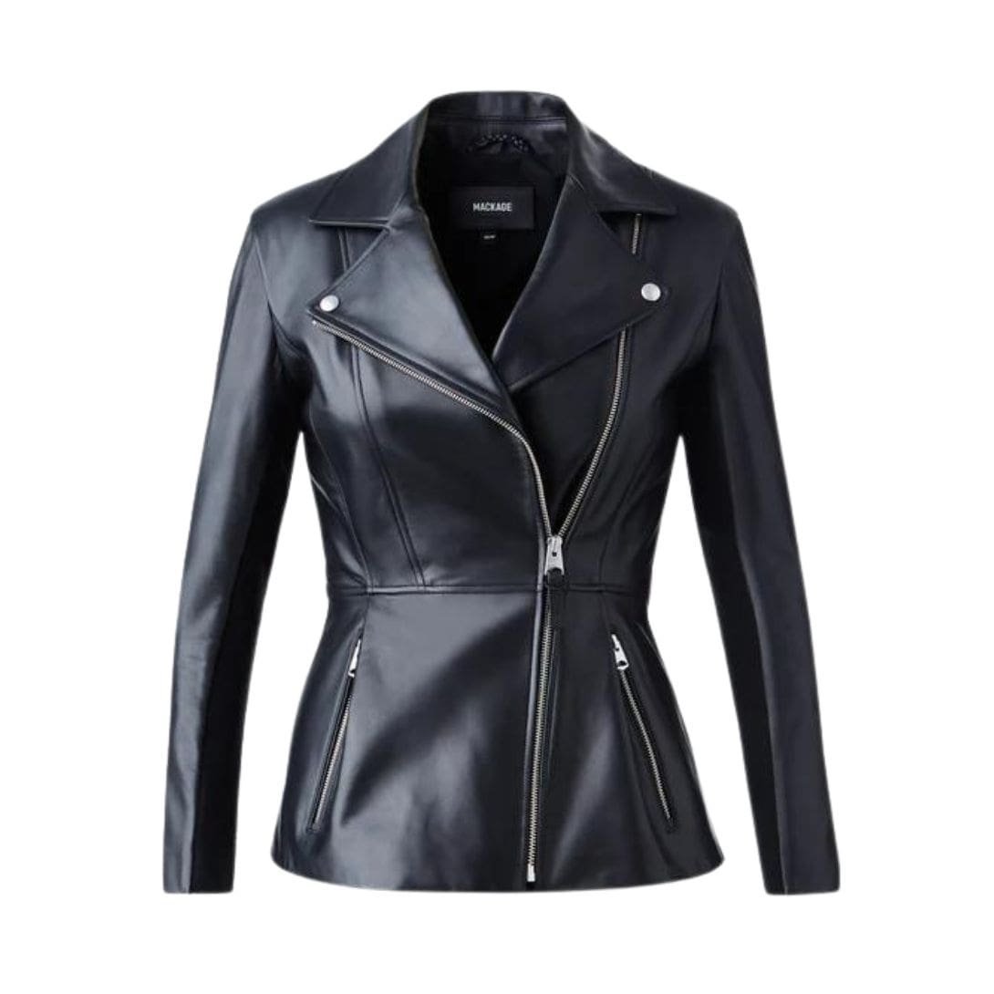 Introducing Mackage Day Leather Biker Jacket with Peplum, a classic biker jacket expertly tailored from supple and sustainable lamb leather. This form-fitting jacket features a pleated peplum with a subtle flounce, giving it a distinctive silhouette. Structured shoulders with pads enhance the sculptural look, while back-sleeve rib inserts provide perfect comfort. A luxurious, ultra-chic style icon.